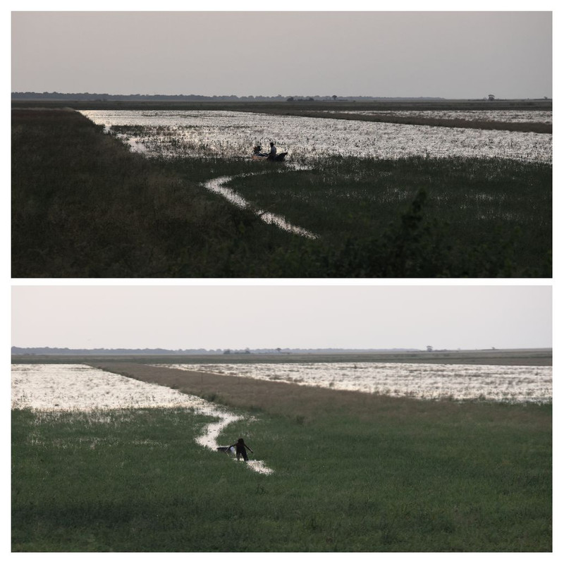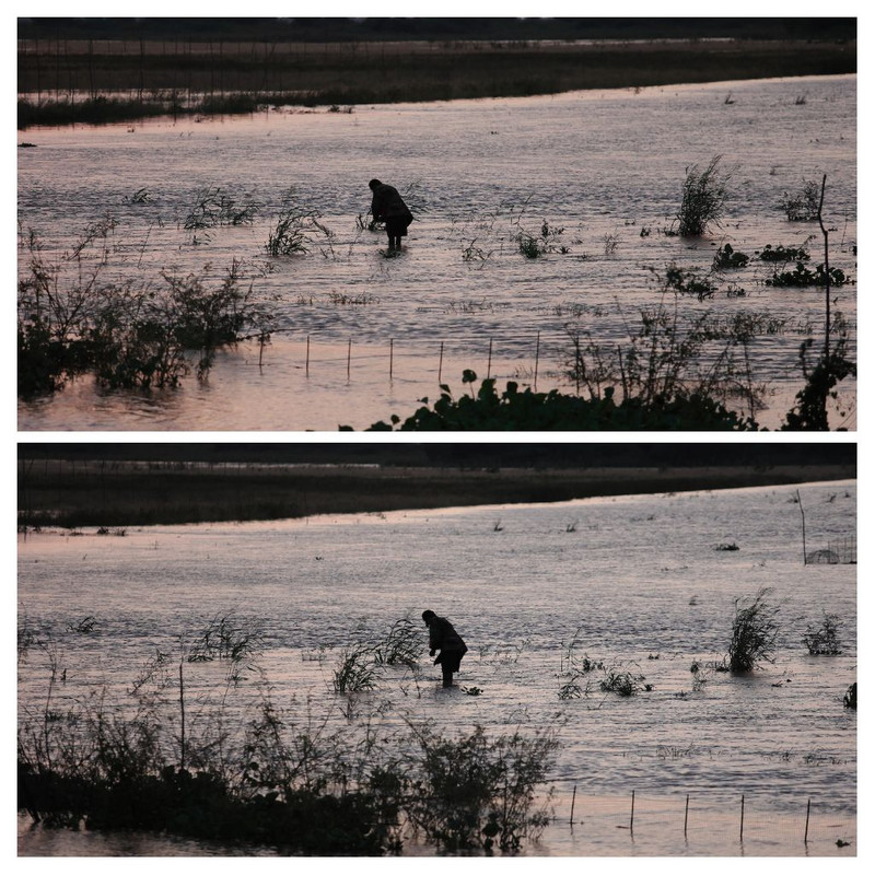 Lampada in fronte e secchiello in mano per il raccolto di molluschi al tramonto, nelle basse acque della laguna dove si può scorgere i pali di bambù che tengono le reti e le nasse, sia in basso all'immagine sia in alto con la long-tail boats per gli spostamenti. Immagini scattate dal battello e croppata per dare una migliore inquadratura (almeno per il mio parere).