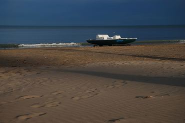 The small boat in the gray sea.