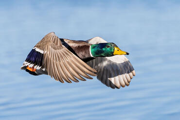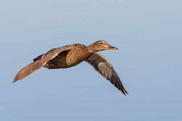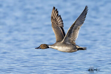 Wigeon in flight over Lake Fogliano