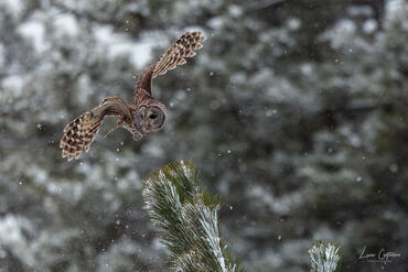 Barred tawny owl in flight