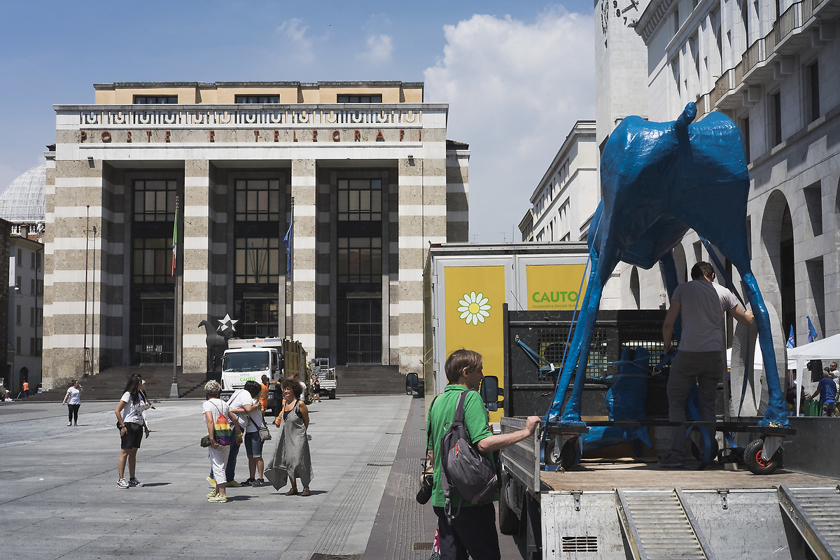 La partenza del corteo era fissata in Piazza Vittoria per le 14. Noi, che in confronto “la metropolitana di Tokyo arriva in ritardo”, eravamo già sul posto circa mezz'ora prima, e tra un “che lente montare?” e “che ISO impostare?” ci siamo ritrovati a scaricare da un furgoncino una scultura gigante di un cavallo azzurro. “Un cavallo gigante? Che c**** centra?”, ho pensato appena ho visto arrivare questo strano equino dalla testa smontata. Dopo aver rivolto questi interrogativi alle simpatiche signore che lo accompagnavano, ho scoperto che questa enorme scultura portava con sé un messaggio incredibile, anzi dei messaggi incredibili! Questi erano stati scritti su piccoli fogliettini inseriti nella pancia dell'animale, o almeno così mi è stato raccontato.