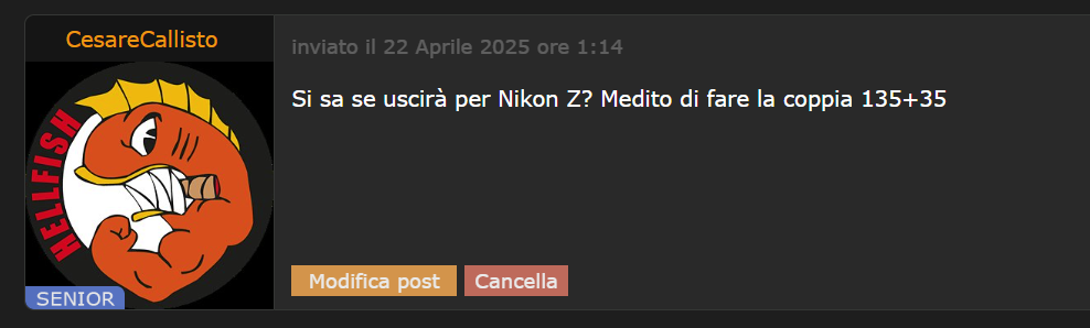 in Obiettivi il 21 Dicembre 2025, 11:42 Ritengo che le foto che ho visto in giro del Viltrox 35 LAB rappresentino pienamente la resa che mi piace da un 35 mm superluminoso, di contro ha dimensioni enormi ma ancora sul filo dell'accettabile. Era un sacco di tempo che speravo che lo facessero per Nikon Z. A quanto pare quel giorno è arrivato! ![]() Purtroppo tra la pletora di 35 non trovavo quello "giusto", il Viltrox mi sembrava la soluzione più adatta, tanto che avevo meditato pure prenderlo con l'adattatore nativo SONY/NIKON ma sinceramente mi sono rotto le balle di campare di accrocchi. In tempi non sospetti ho pure fatto questa dichiarazione ![]() Oggi, vedendo l'annuncio, l'ho preso insieme al suo fratello! Così posso finalmente mettere in pensione FTZII e 70-200 2.8 VRII che mi ha accompagnato per oltre 2 anni ma che non ho mai pienamente gradito tra rumoracci e anello adattatore. ![]() P.s. Avessi approfittato del BF sicuramente avrei risparmiato un altro centone abbondante prendendo il 135... Ma fottesega, il 135 diciamo che era secondario, senza la spinta del 35 avrei continuato con lo zoom. 3 commenti, 307 visite - Leggi/Rispondi in Obiettivi il 26 Dicembre 2023, 19:13 Volevo sostituire il mio 70-200 VR II con il nativo Z, non ho trovato molto materiale su Juza col cerca, a parte chi l'ha acquistato all'inizio e qualche prova coi TC, ho capito che va molto bene e basta ma spero che si sia aggiunto qualche utilizzatore negli ultimi 2 anni. Il VR II l'ho sempre trovato un pochino sottotono a livello di stabilizzatore, per avere immagini davvero nitide devo stare a almeno 1/200 quando con il Canon IS II recuperavo 1 stop in più se non uno stop e mezzo, la stessa foto senza IS partivo da 1/400 per farvi capire. Inoltre con FTZ fa un sacco di rumoracci, nonostante l'AF vada molto bene. Il mio tipo di fotografia col 70-200 è quello solito, sport spesso al chiuso e in luce orribile, ritratti, paesaggi e still life, metto qualche foto fatta col VR II: ![]() ![]() ![]() ![]() Sarei curioso di sapere come vada la lente dai possessori e aggiornare un pò le impressioni d'uso, ormai il prezzo europeo è sceso sotto i 2mila euro e l'occasione mi sembra troppo ghiotta per non liberarmi dell'FTZ, avere un tele nativo, silenzioso, ben stabilizzato, moltiplicabilissimo 2X e con un buon RR nei close-up. Inoltre sembra avere uno sfocato più bello del VR II, a nitidezza non commento, mai visto un 70-200 scarso. 10 commenti, 1293 visite - Leggi/Rispondi in Fotocamere, Accessori e Fotoritocco il 04 Ottobre 2023, 19:22 Dato che qualcuno mi ha chiesto di postare le impressioni con questa macchina, similmente a quanto feci con la X-T5, adesso vi cuccate anche il topic sulla D850. Come molti sanno all'apparire dei problemi di freeze sulla T5 in registrazione immagine su doppio slot, mi sono astenuto dal lanciarla dal muro e l'ho semplicemente sostituita, non potevo permettermi il blocco in momenti irripetibili. Lato ML non potevo economicamente acquistare un'ammiraglia, avrei potuto prendere il prodotto più maturo che c'è (secondo me la R6 tra le mid) ma poi sarei stato castrato da un sistema lenti RF abbastanza assurdo e troppo costoso e sinceramente non mi andava di adattare per motivi ergonomici già accusati in passato, avrei preferito una 1DX a quel punto, già avuto ed apprezzata e bastevole per i prossimi 10 anni. L'ottica per me fondamentale è il 70-200 2.8, dai ritratti allo sport agli spettacoli in bassa luce, ho proprio bisogno di quello insieme ad una fotocamera veloce. Questo ha escluso parecchie macchine, seppur buone, dalla scelta e per un motivo o per l'altro sono passato dal voler riprendere una 1DX alla... D850. Una fotocamera che spesso ho valutato e sognato ma per un motivo o per l'altro ho sempre avuto paura dei megapixel, finché non ho avuto la T5 e mi sono convinto che sia un falso problema. ![]() Il motivo di esclusione principale della 1DX è stato legato al form factor da ammiraglia e al peso, io sono anche un paesaggista e non amo doppi body, pertanto la fotocamera che mi accompagna deve essere una tuttofare! Il BG integrato significa che per fare scarpinate per un'alba con la fotocamera serve uno zaino ingombrante e pesante, mentre la misura massima che voglio avere dietro è il 150 lowepro. Inoltre la gamma dinamica della 1DX non era esaltante e dal punto di vista paesaggistico non mi piaceva, ai tempi ho tentato di sopperire con la 5D IV ma anche lei era un pò più lenta, non così precisa come la vecchia serie 1, non la sentivo la fotocamera giusta. ![]() ![]() La D850 è estremamente diversa da entrambe e secondo me è stato un prodotto rivoluzionario, più della D700 di cui è erede diretta in quanto D800 e D810 erano fotocamere decisamente più lente. Preciso che prima di decidere del tutto ho affiancato prima una D4 in prova e poi una D4S in acquisto: ![]() Perché? Il motivo è semplice, sulla carta non avevo bisogno di nulla di più di quello che può offrire una D4 come raffica e qualità d'immagine, la delusione è stata lato AF, non è così preciso e ripetibile come la D850! Non ci volevo credere nemmeno io ma una fotocamera non ammiraglia andava meglio di... Un'ammiraglia! Ho ripetuto la prova con la D4S credendo che la D4 fosse macinata/starata e niente, la D850 ha un AF cecchino, lag di scatto ridottissimo e un sensore che pure coi formati più piccoli fa sempre la sua figura. Sia in JPEG che in RAW si può scegliere tra 45, 26 e 12 megapixel e le foto sono sempre eccezionali, naturalmente se devi consegnare JPEG al volo in bassa luce nei formati più piccoli hai un rumore meno avvertibile, semplicemente si zoomma meno! Insomma la precisione di questo modulo AF è davvero alta e c'è da dire che Nikon ha pensato ad una cosa che non faceva più dai tempi della D700, dopare la macchina tramite battery grip e batterie della D5! Praticamente si passa ad avere 9 FPS spinti dalle batterie 3S, rendendola una macchina davvero efficace per la fotografia sport