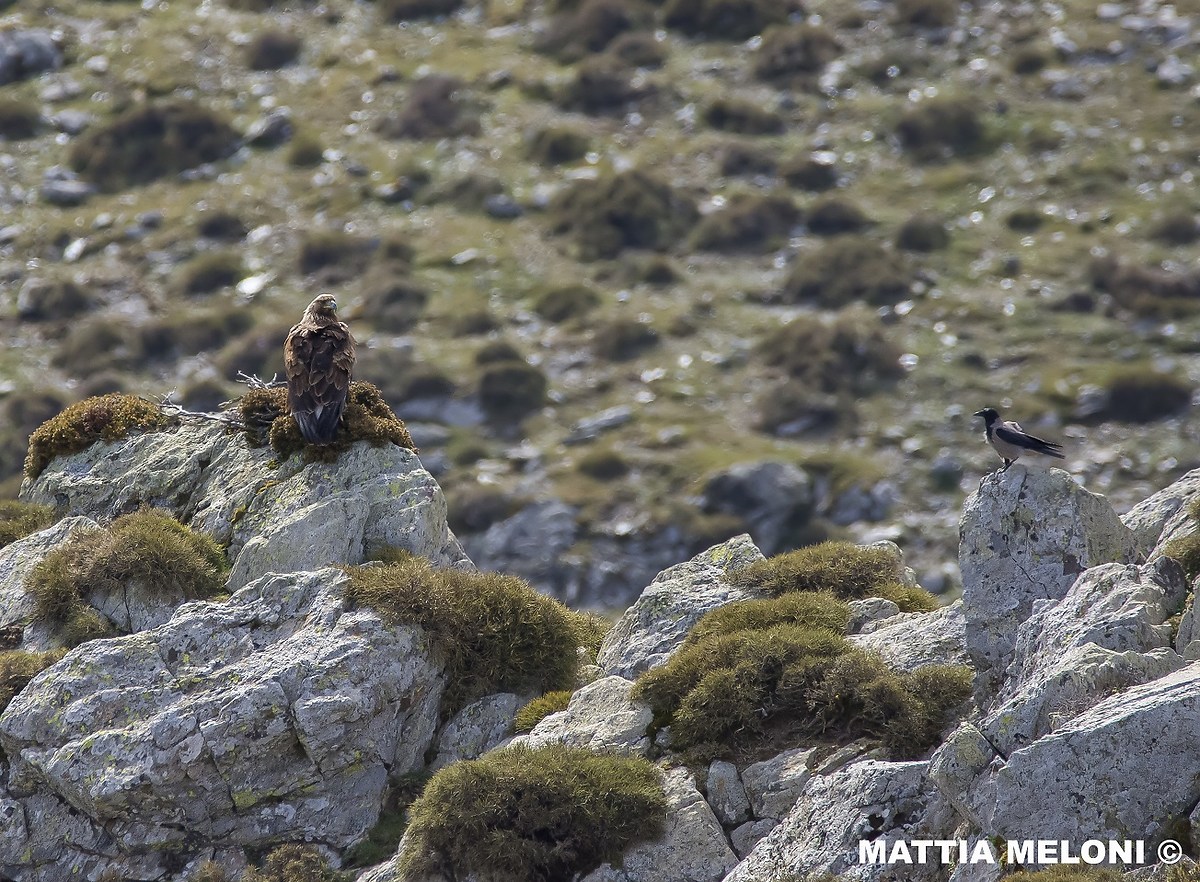 È proprio vero .... a volte la fortuna premia gli audaci.. quando meno te lo aspetti ecco l'incontro che tanto desideravi, quello con la regina dei cieli; è da qualche anno che tento di fotografare l'aquila reale sempre con scarsi risultati. L'aquila come noto è un rapace particolarmente schivo dotato di una vista super che gli permette di individuare prede e pericoli (uomo compreso) a distanze siderali; la maggior parte degli incontri che ho avuto fino a oggi sono stati sporadici e sempre a distanze ragguardevoli per di più in volo, ma oggi finalmente il caso ha voluto regalarmi un incontro del tutto inaspettato e tutto sommato ravvicinato. Stamattina ho notato un gruppo di mufloni in lontananza, mi sono avvicinato strisciando per non essere avvistato (col vento a favore), mi sono posizionato dietro a una roccia; erano a circa un 80-100 metri di distanza non proibitiva per il mio obiettivo 150-600 mm; ho iniziato a scattare. Dopo una decina di minuti ho scorto in cielo una sagoma col suo volo inconfondibile, era la regina! Subito dopo ne ho scorto un'altra, era probabilmente la compagna… si aggiravano con fare minaccioso vicino al b ranco dei mufloni che in questo periodo hanno i piccoli i quali sono una ghiottissima preda. D'un tratto arriva un bell'esemplare e si poggia su una roccia a me vicina sempre sugli 80-100 metri di distanza; da non credere avevo il cuore in gola, che emozione! Ho iniziato a scattare a raffica. L'aquila è rimasta li per circa 5 minuti circa… intanto però è arrivata una cornacchia e gli si è avvicinata all'aquila per fare le solite azioni di disturbo; l'aquila non si è scomposta più di tanto, ha aperto il becco e ha messo in fuga la cornacchia; dopo un po' si è fatta viva la compagna che gli si è avvicinata come per rimproverarla per la pausa-caccia troppo lunga, a questo punto si è levata in volo…. Che dire un incontro che mi ha regalato bellissime emozioni e qualche scatto ricordo purtroppo per tutta la ripresa ero controluce! sarà per la prossima volta…..