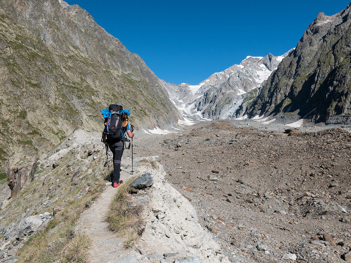 Finalmente arriva ferragosto. Alle 04:45 sono a Biasca in attesa degli altri due: Ronnie e suo padre Giorgio. Il viaggio verso Courmayeur risulta velocissimo! Circa 300km in 3 ore. Beviamo un veloce caffè in paese e ci dirigiamo verso il parcheggio nella Val Veny. Raggiunta la sbarra lasciamo l'auto e ci incamminiamo lungo la strada colma di turisti che si dirigono verso la Cabane du Combal. Giunti in zona rifugio imbocchiamo il sentiero che conduce sul lunghissimo, nei primi quattro km roccioso, Glacier du Miage in direzione del rifugio Gonnella.
