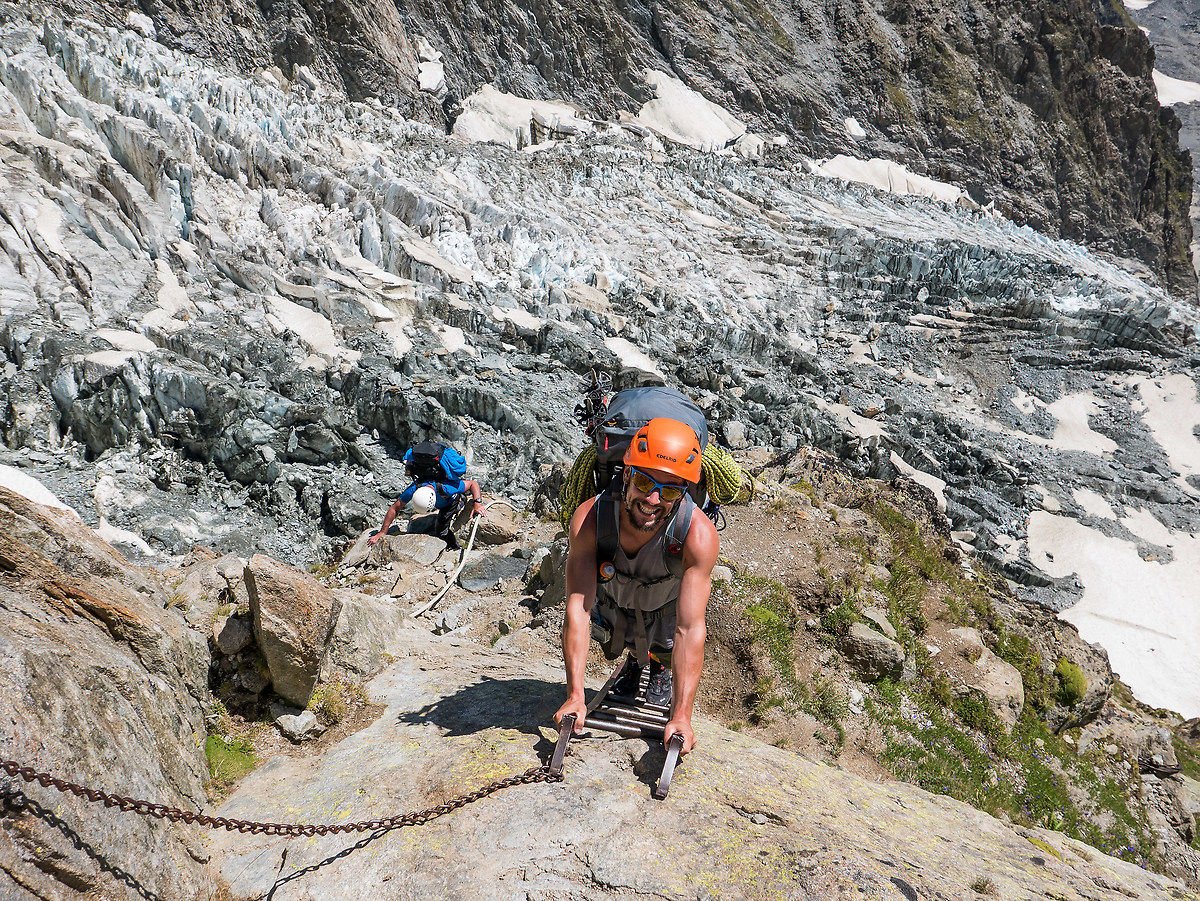 Il percorso, ad eccezione della prima parte sulla morena, non è molto definito e dobbiamo scavalcare buchi, crepacci e rocce smosse. Dopo circa 3 ore raggiungiamo la parte alta del ghiacciaio dove scendono le diramazioni del Glacier du Mont Blanc, del Glacier du Dome e del Glacier de Bonassay a quota 2500 metri. All'improvviso un grande boato ci fa saltare per aria. Una frana scende da un canalino a circa duecento metri da noi arrivando a cinquanta metri dalla traccia di salita. Nella nebbia formatasi dal crollo procediamo mantenendo la destra del ghiacciaio fino all'imbocco del ripido sentiero che porta al rifugio. La successiva tratta concentra tutti il dislivello per arrivare ai 3072 metri del rifugio. Il percorso è a tratti esposto ma attrezzato con scalette e corde fisse.