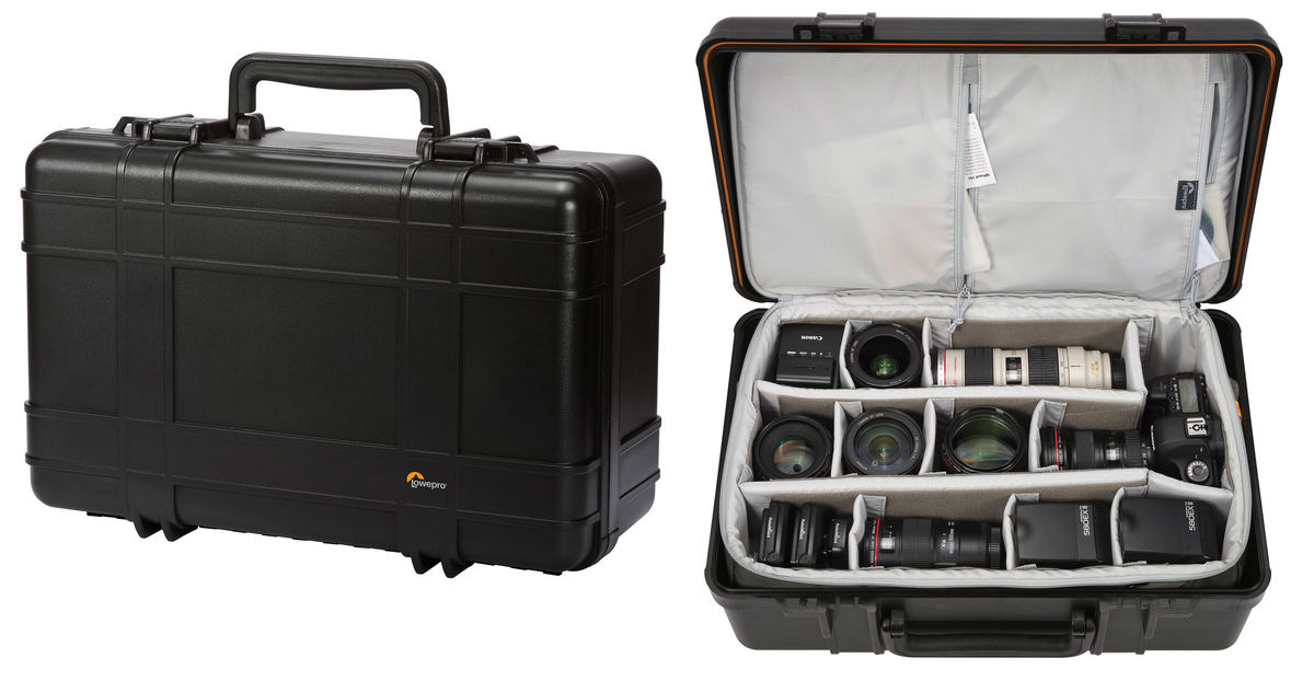 The Lowepro Hardside 400 Photo is a camera hardcase with space for up to 1-2 camera bodies and 6-8 lenses. It measures 55 x 23 x 37 centimeters and it weights 6.1 kg; these dimensions are not compatible with the hand luggage limits of most airlines.