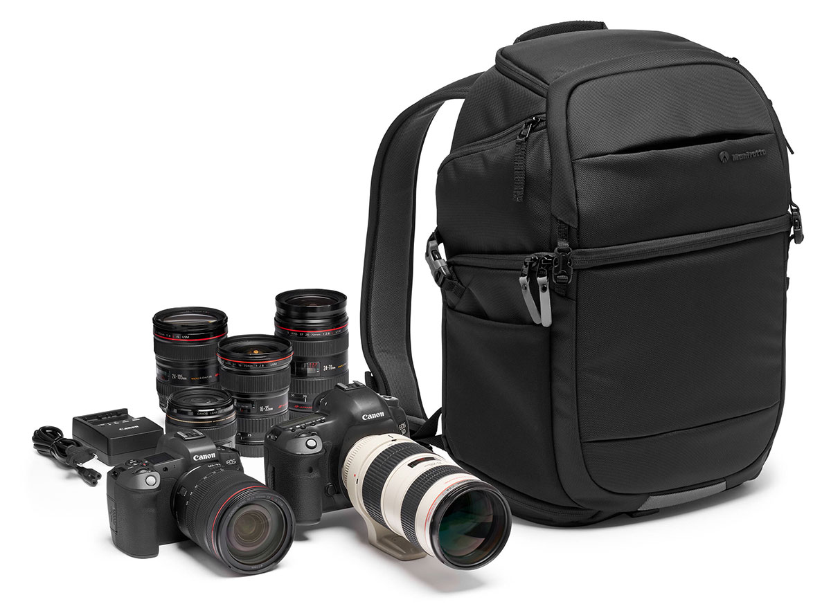 The Manfrotto Zaino Advanced Fast III is a camera backpack with space for up to 1-2 camera bodies and up to 4 lenses, other than a 15" laptop. It measures 31 x 19 x 44 centimeters and it weights 1.23 kg; these dimensions are compatible with the hand luggage limits of most airlines.
