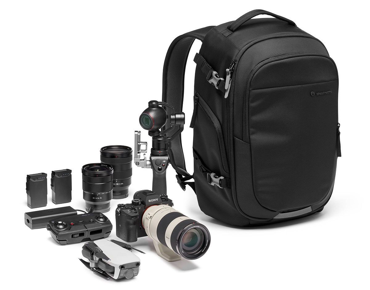 The Manfrotto Zaino Advanced Gear III is a camera backpack with space for up to 1-2 camera bodies and up to 4 lenses, other than a 15" laptop. It measures 33 x 18 x 47 centimeters and it weights 1.16 kg; these dimensions are compatible with the hand luggage limits of most airlines.
