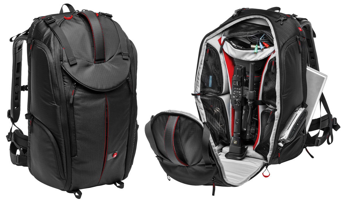 The Manfrotto Zaino video grande (MB PL-PV-610) is a video backpack with space for up to 2-3 camera bodies and 6-8 lenses. It measures 64 x 34 x 31 centimeters and it weights 3.7 kg; these dimensions are not compatible with the hand luggage limits of most airlines.