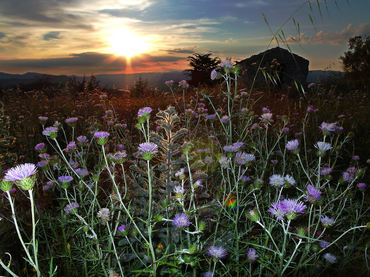 Papaveri si stagliano alla luce del tramonto