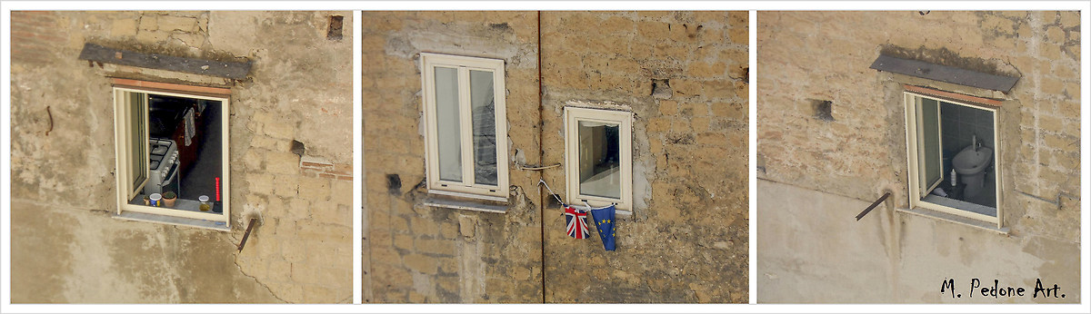 Sì, il tuo trittico racconta la storia del Regno Unito, che si vuol staccare dall'Unione Europea, appesa alla finestra di un wc, per dirigersi solitaria verso la finestra della cucina, dove si sa: si magna!