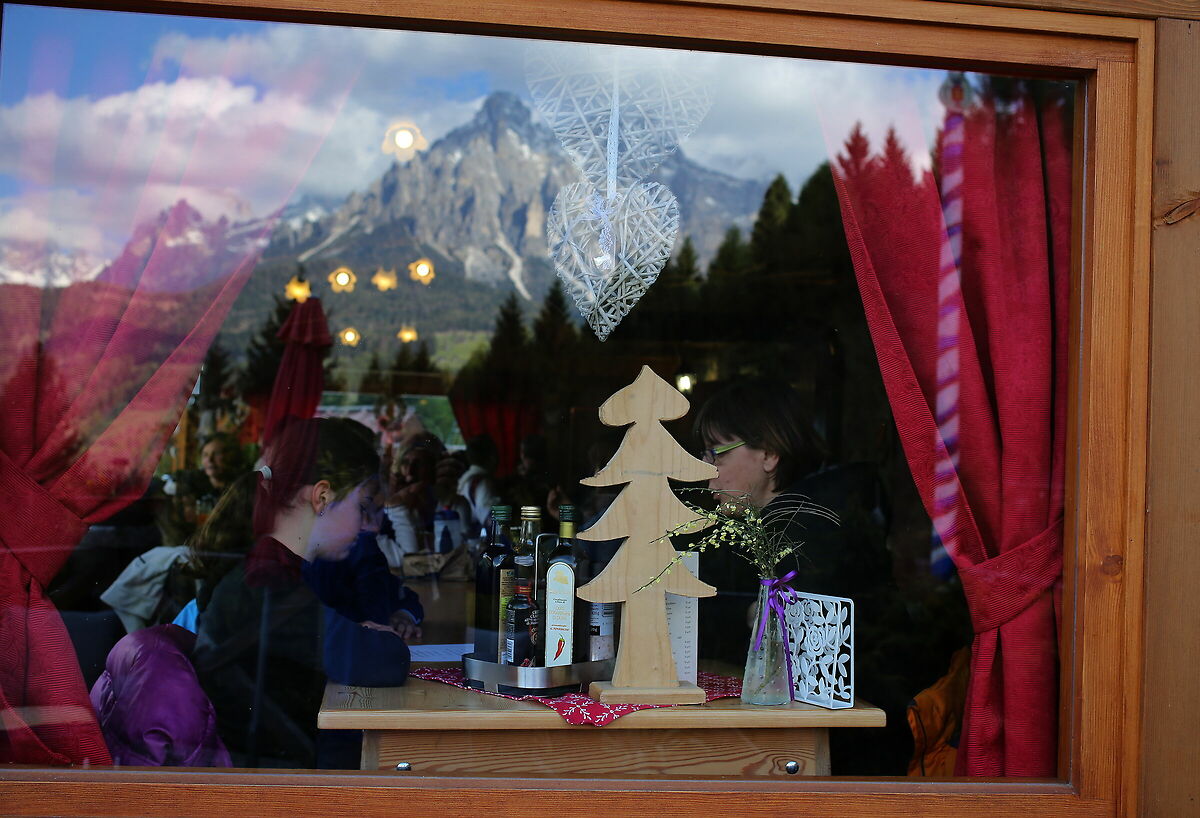 Mamma e figlia all'interno di una baita di montagna scelgono dal menù "a la carte" e la vista dalla finestra allarga il cuore!!