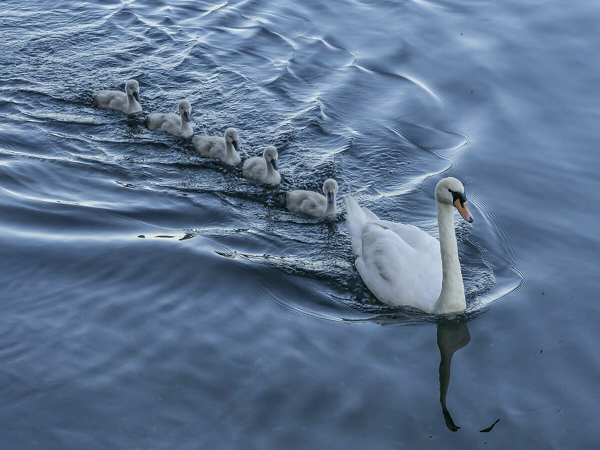 Femmina di cigno con cinque pulcini