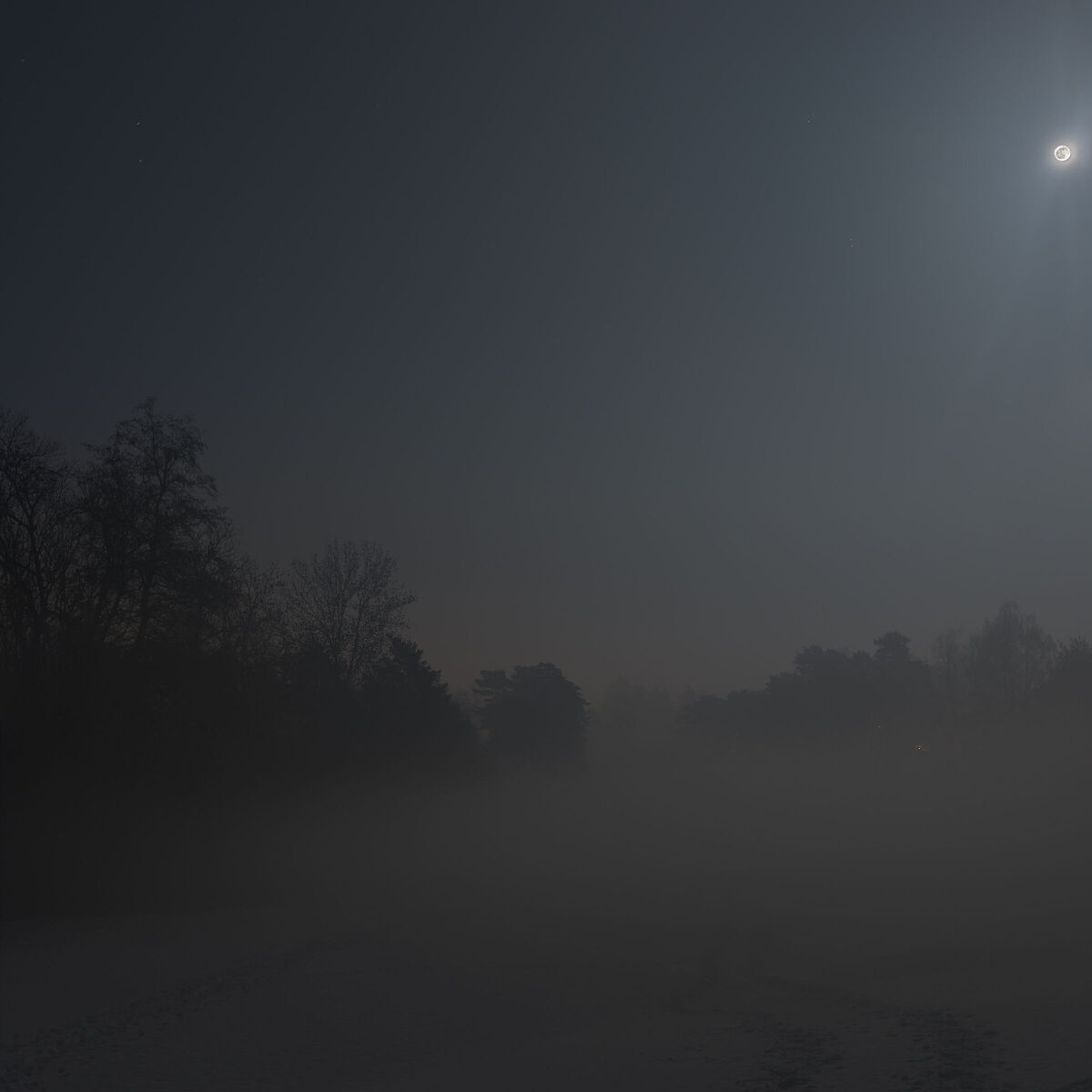 Campo di golf, luna neve e nebbia