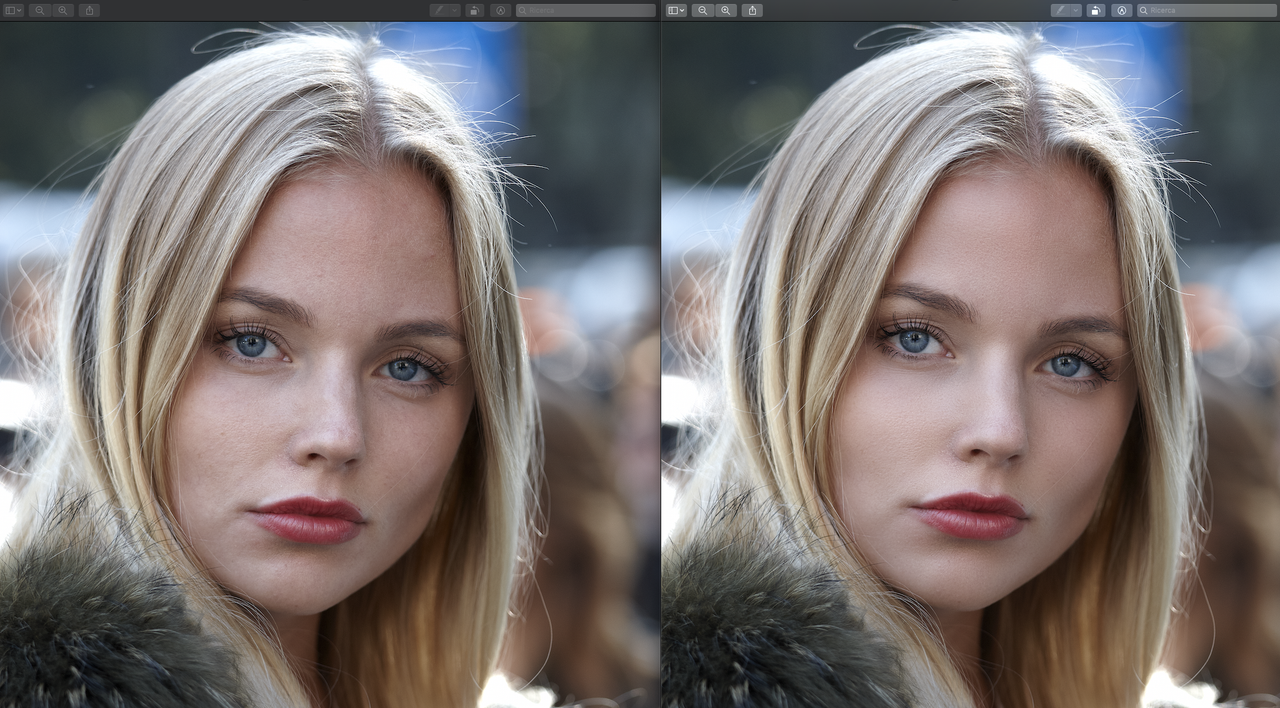 Ciao a tutti! Dunque, sarà che in quarantena si ha più tempo a disposizione (nonostante lo smart working), sarà che però al weekend finiti gli esercizi fisici ed il sole in terrazzo, la noia ogni tanto mi pervade, sarà sarà quel che saràààà Stavo pensando di creare dei video dove spiego come faccio io a postprodurre le mie immagini. Ovviamente, qui sul forum ci sono dei fior di professori molto più skillati di me... ma mi rendo anche conto che quando le competenze si fanno "profonde", le si condividono solo a pagamento, quindi tutti si guardano bene dallo svelare i loro "segreti". Siccome io non ho questo livello di competenze, proverò a raccontarvi come faccio a sviluppare le mie foto, spiegandovi qualche tecnica che ho imparato a qualche corso, o con l'esperienza (sbattendoci la testa), o in internet. Ovviamente tutto gratis. Nulla di difficile, potremmo chiamarlo "photoshop for dummies", cose semplici che probabilmente molti di voi sanno a menadito, cose facili da fare, che non prevedono una grossa conoscenza alle spalle. Ovviamente, i miei esempi saranno tutti relativi al tipo di fotografia che pratico io e quindi "landscape" e "portrait". Io lavoro molto con C1 ma inizialmente vorrei condividervi delle metodologie su Photoshop, perchè so che molti C1 non ce l'hanno, quindi si partirà sempre da un tiff già premasticato dal raw converter. Potrebbe interessarvi? Non sono esperto di video, mi sono informato stamattina su come si fa a registrare il video del desktop, ho poca dimestichezza con queste cose, tra l'altro, devo comprare un microfono esterno (ne ho visto uno su Amazon a 20 euro) perchè il mio Minimac non ce l'ha, spero di riuscire a fare funzionare tutto. Onestamente (e non mi vergogno a dirlo), credo che dovrò aprire un canale su youtube per depositare i video ma non so come si fa, se qualcuno l'ha già fatto potrebbe darmi qualche dritta. Se una volta visti i tutorial, qualcuno avesse qualche metodo più facile ed efficace, è il benvenuto ad intervenire. Ripeto, nulla a che vedere con il fotoritocco professionale (Made, non mi picchiare!) Per farvi un esempio partirei da qualche video per mostrarvi come ritoccare il viso (se fate una foto alla vostra ragazza/ compagna/ moglie). Qui sotto trovate a sx la foto di partenza ed a dx la foto d'arrivo.