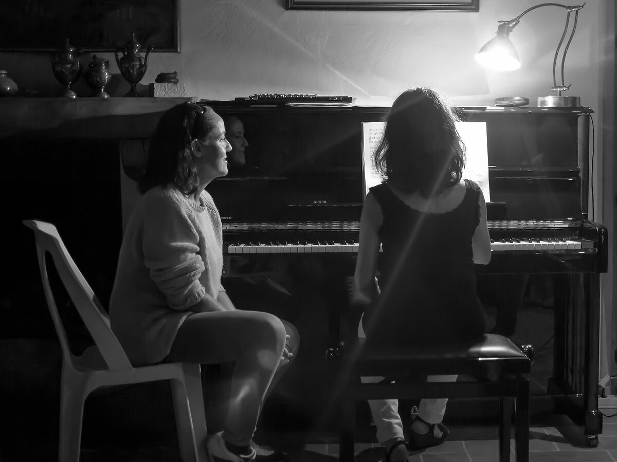 La bambina, con gli occhi chiusi, sembra essere concentrata e impegnata a creare, ruotando la manovella, la "sua" musica.
