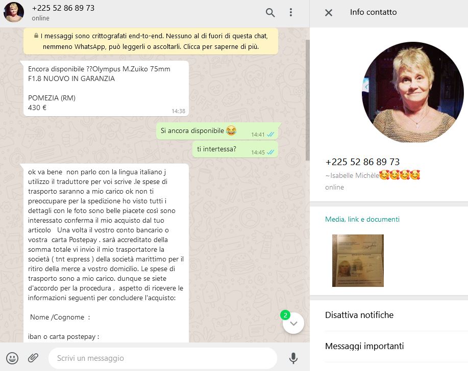 Proprio a proposito, mi è appena arrivata una richiesta su Whastapp che è SICURAMENTE un tentativo di raggiro. Si riconosce dal prefisso telefonico (+225) dall'uso del traduttore e dalla faccia rassicurante (un tantino ebete ) Ecco. BLOCCATE subito queste richieste!