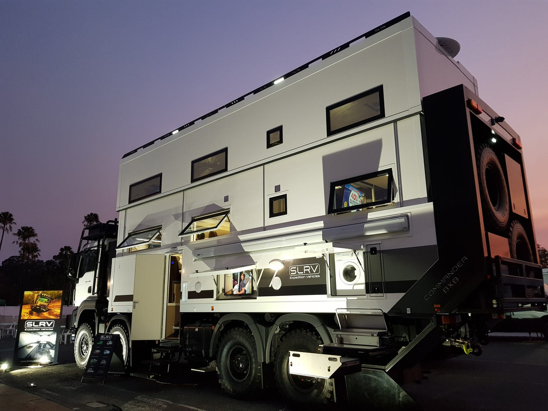 Il secondo che vi segnalo è l'enome Commander 8x8 di SLRV Expedition Vehicles. Può ospitare 10 persone e anche lui ha un design "slide-out", ma in altezza: all'occorrenza si può creare un secondo piano con 8 posti letto, che si aggiungono ai due posti letto al primo piano.