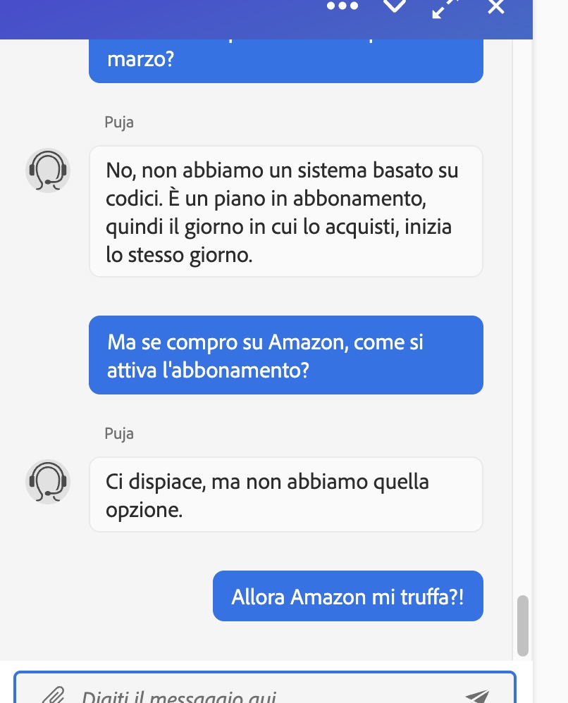Ora sento Puja. Puja scrive in inglese, io scrivo in inglese. Puja dice che non capisce. Poi rispiego in italiano e risponde: No, non abbiamo un sistema basato su codici. È un piano in abbonamento, quindi il giorno in cui lo acquisti, inizia lo stesso giorno.