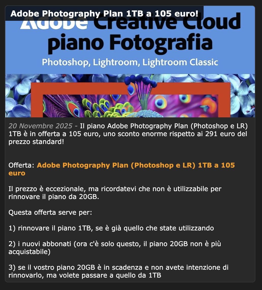 Conviene acquistare il codice di Amazon a pochi mesi dalla disdetta, oggi il più conveniente è il Fotografia 1TB a 120 euro al Prime Day ( ne sono circa 3/4 all'anno ). Unica pecca del piano Fotografia a 1TB che da quello che leggo dal sito Adobe è che ha 25 crediti generativi al mese ( forse un errore ), per molti potrebbe essere un problema. E' strano perchè il 20gb ha 250 crediti generativi al mese ( ancora ora ), purtroppo da Adobe potremmo aspettarci il cambio del 20gb in 1tb.
