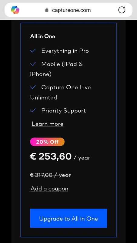 Su questo forum abbondano le critiche sulla politica esosa di Adobe, ma in realtà sono quelli di Capture One i prezzi più cari. La licenza perpetua, ad es., la vendono a 360 euro e oltretutto sono esclusi gli aggiornamenti di qualsiasi tipo. Tornando al topic in passato ci sono state offerte in occasione del black friday ma solo occasionalmente. Per ora non ci sono segnali incoraggianti ma conviene comunque attendere fini alla scadenza del periodo delle offerte; non si sa mai…