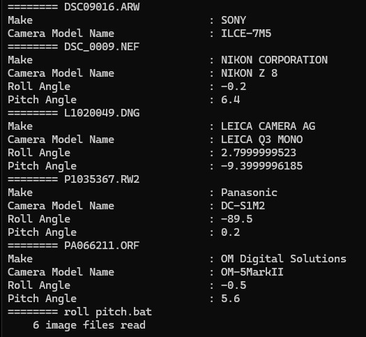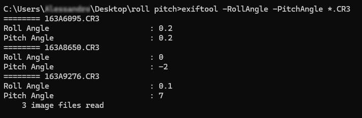 Da oltre 10 anni mi pongo la questione : perché i Sw di edizione Photo utilizzano l'analisi del contenuto delle immagini (a forza di algoritmi e d'AI) per raddrizzare le immagini, con risultati a volte deludenti o inefficaci (in assenza di riferimenti sfruttabili nel frame), allora che potrebbero utilizzare i dati exif (forniti dal giroscopio integrato a tutte le fotocamere da almeno 10 anni se non più) che sarebbe infinitamente più semplice e di una precisione assoluta?...semplicemente perché questi dati pur essendo disponibili non sono iscritti negli exif, possibile che non ci sia un solo ingegnere in 10 anni che ci abbia pensato? non costerebbe 1 centesimo e sarebbe LA Soluzione, sia riportando i gradi degli angoli orizontale e verticale manualmente su un SW d'edizione Photo (Ps, Lr, ecc..), sia automaticamente con dei SW capaci di leggere e sfruttare questi metadati. Fin'adesso solo Pentax ci aveva pensato associando l'orizzonte artificiale e i movimenti del sensore stabilizzato per raddrizzare l'orizonte (nei limiti della mobilità del sensore), ma non sono andati oltre. Attualmente pero la faccenda sembra avanzare, nelle fotocamere recenti (2024/2025) questi dati vengono infine registrati negli exif, per adesso sono visibili solo con l'ultima versione di Exiftool indicati in gradi (vedi screenshot di un cr.3 della Eos R6 mk3) quindi già sfruttabili manualmente con Ps, Lr, ecc.., speriamo che la logica trionfi sulla stupidità e il marketing e che fra breve i SW foto saranno capaci di raddrizzare automaticamente le immagini basandosi sugli exif invece di "sprecare" le risorse informatiche (algoritmi, AI) raddrizzandole secondo il loro contenuto, metodo finalmente non molto preciso vedi inefficace in assenza di riferimenti adeguati nel frame. Spero che prossimamente l'iscrizione del Roll e Pitch sarà generalizzata negli exif di tutte le fotocamere (aggiornando il firmware si potrebbe ottenere per tutte le fotocamere anche anziane) e che i Sw Photo saranno di leggerli e sfruttarli.