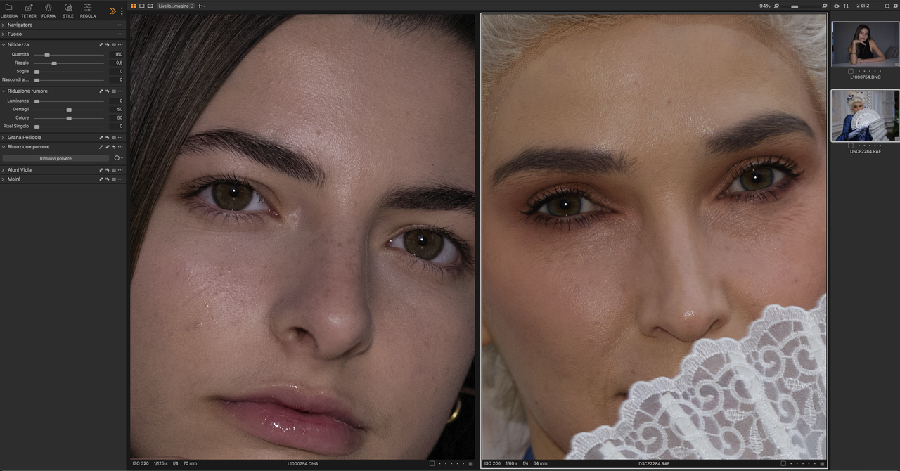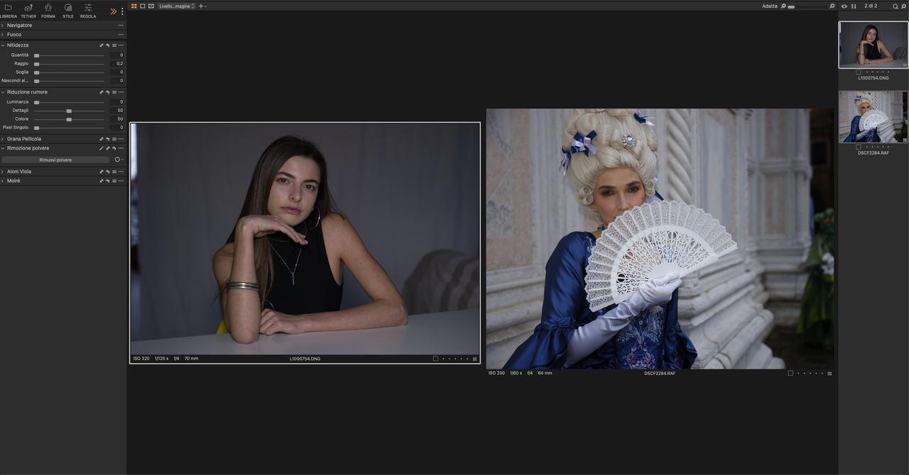Buongiorno amici, sono di ritorno da una due gg a Venezia e sto sistemando un po' di foto. Come saprete, volevo portare la Leica S2 ma mi è caduta e quindi ho portato la GFX con il 32-64 che credo sia il miglior zoom del sistema GFX. Ora, non entro nel dettaglio dell'esperienza, sicuramente ci farò un video prossimamente, ma ovviamente mentre scattavo pensavo dentro di me cosa avrei fatto se avessi avuto la S2 invece della GFX. Ebbene, in alcuni casi avrei portato a casa foto migliori, in altri foto peggiori, dei vari casi ne parlerò dettagliatamente nel video. Quello su cui però vorrei porre l'attenzione è il PERCHE' adoro la resa della S2 mentre quella perfettina della GFX mi lascia un po' indifferente. Come sapete io nel CCD ci vedo una resa più materica ed un'acutanza maggiore, mentre il CMOS lo vedo sempre troppo "liscio" e perfettino. Mentre stavo sistemando gli scatti stamattina, ho voluto riesumare uno scatto della S2 e metterlo a confronto con uno della GFX che stavo lavorando. Siccome i soliti pignolazzi verranno a dire che le condizioni non sono le stesse, provo a smontarli mostrando uno scatto della S2 con condizioni di netto svantaggio. Come potete vedere, la S2 è a 320iso (che per un CCD inizia ad essere una sensibilità non "trascurabile" mentre la GFX è a 200iso. La luce nello scatto della GFX è maggiore, siamo all'aperto, mentre in quello della S2 eravamo al chiuso in una stanza. Entrambi gli scatti hanno il flash Entrambi sono a F4, la S2 è a 70mm mentre la GFX è a 64mm Vi mostro lo screenshot su C1