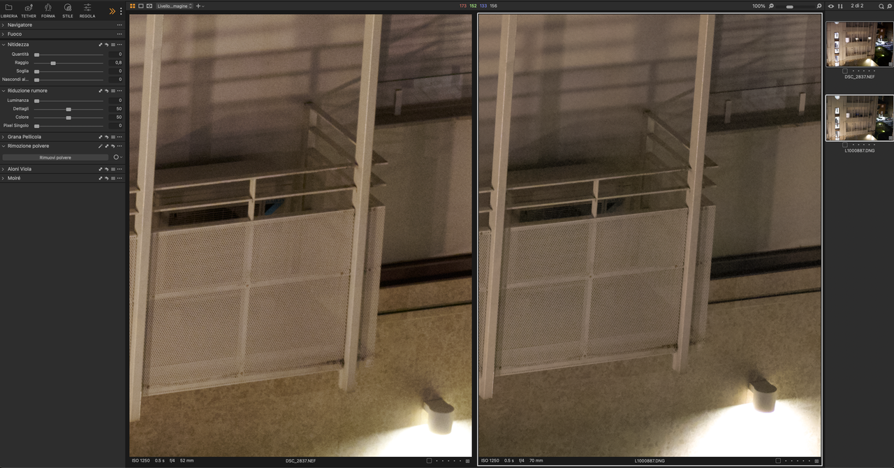 Qui ho messo altri screenshot sul rumore in comparazione con la Nikon Z7, sensore moderno BSI. Z7 con l'ottimo 24-120 e Leica con il suo 70mm Sx Nikon dx Leica a 1250iso (sensibilità massima della Leica). Ho tentato di far entrare più o meno la stessa quantità di luce, forse ne è entrata un pelo di più sulla Leica. Ho tolto denoise e azzerato la nitidezza.