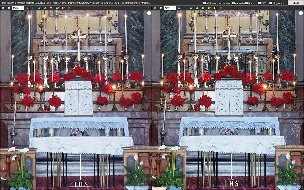 Stamattina mi sono infilato in una chiesa per fare qualche prova: scatto normale e scatto hi-res a confronto; 3200 iso.