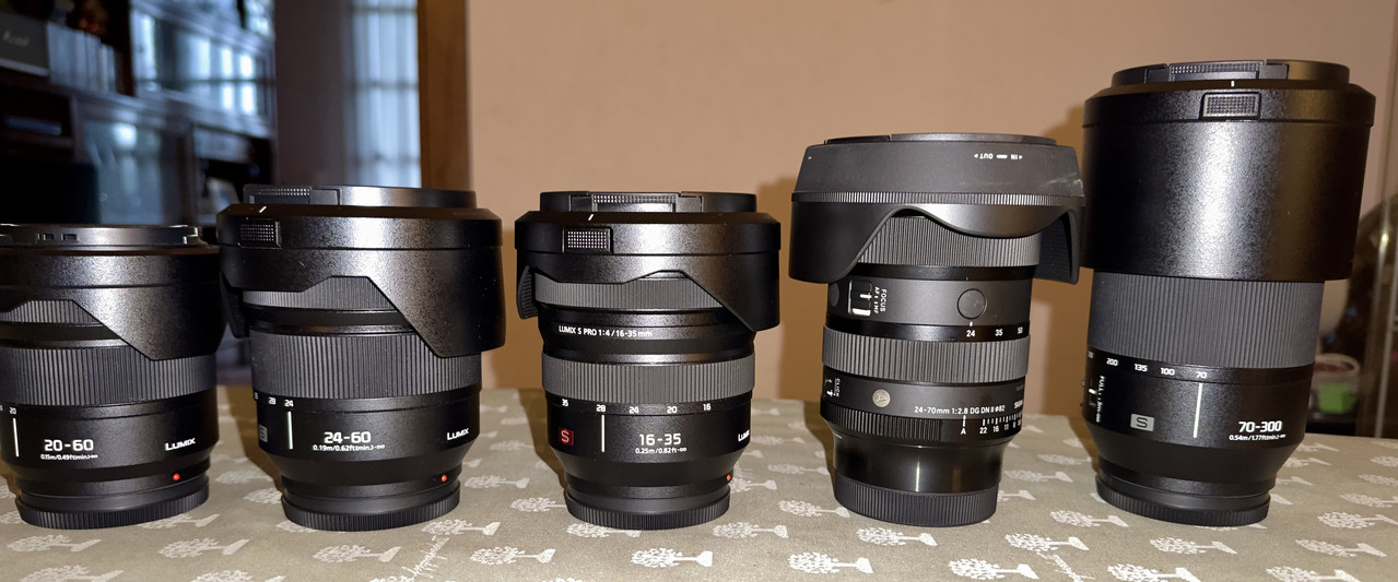 Si parte dal 20-60 che è veramente leggero e piccolissimo. Il 24-60 è praticamenre identico al 16-35 che ho messo proprio per confronto. Il 70-300 è leggermente più grande del Sigma 24-70, per il confronto ho messo il mio che è la serie II. |