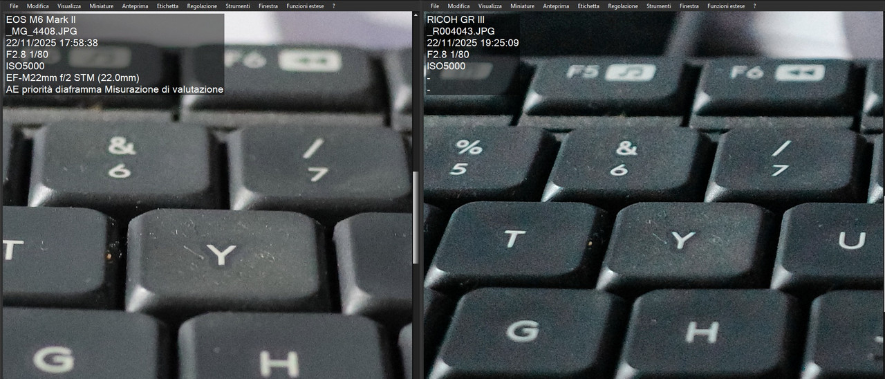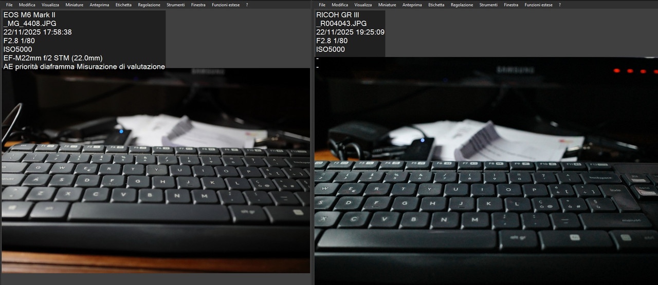 Non posso fare un confronto tra le due generazioni di GR, ma in base alla mia esperienza con Canon reflex FF direi che la GR IV (almeno, la mia) richiede mezzo stop in più. Si tratta di un'impressione però, non ho fatto confronti specifici. |
