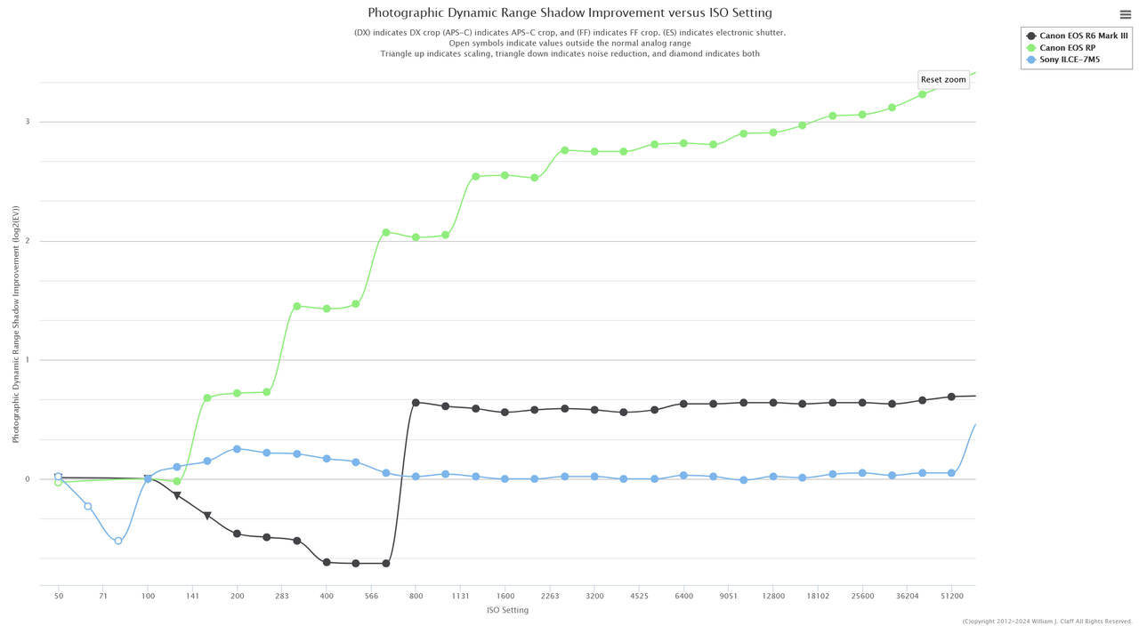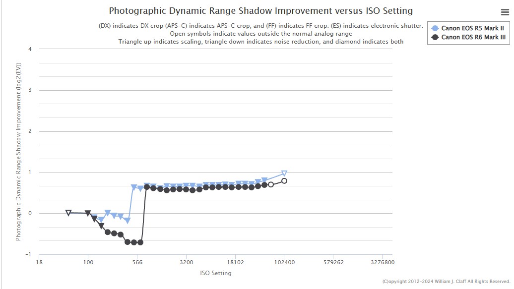 Eppure: per la R6III da 100 a 640 ISO ho una pendenza -1 mentre da 640 a 800 iso ho una pendenza (che ne so) +10. Poi riprendo la -1. Se quanto da te riportato fosse vero dovrei trovarmi, da 100 a 640 con una retta orizzontale a valore 0 (cosa non vera), poi un salto e poi di nuovo con una retta orizzontale (quest'ultimo e' vero)