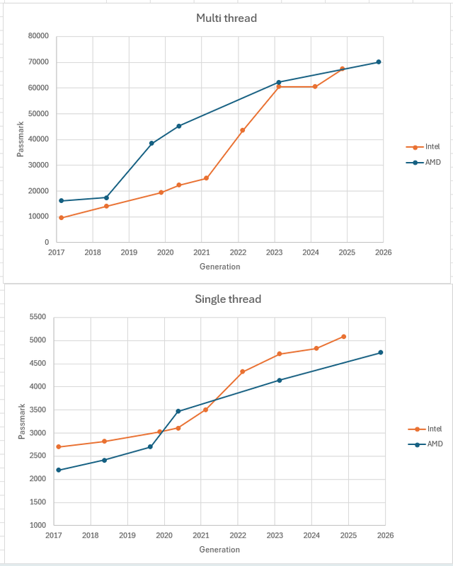 Ho rifatto i grafici mettendoli in ordine temporali ed eliminando serie 4 e 8 AMD. Il Jolly con AMD lo avresti pescato nel 2020 con la piattaforma AM4, mentre con Intel in misora minore ad inizio 2024 con la piattaforma LGA1700