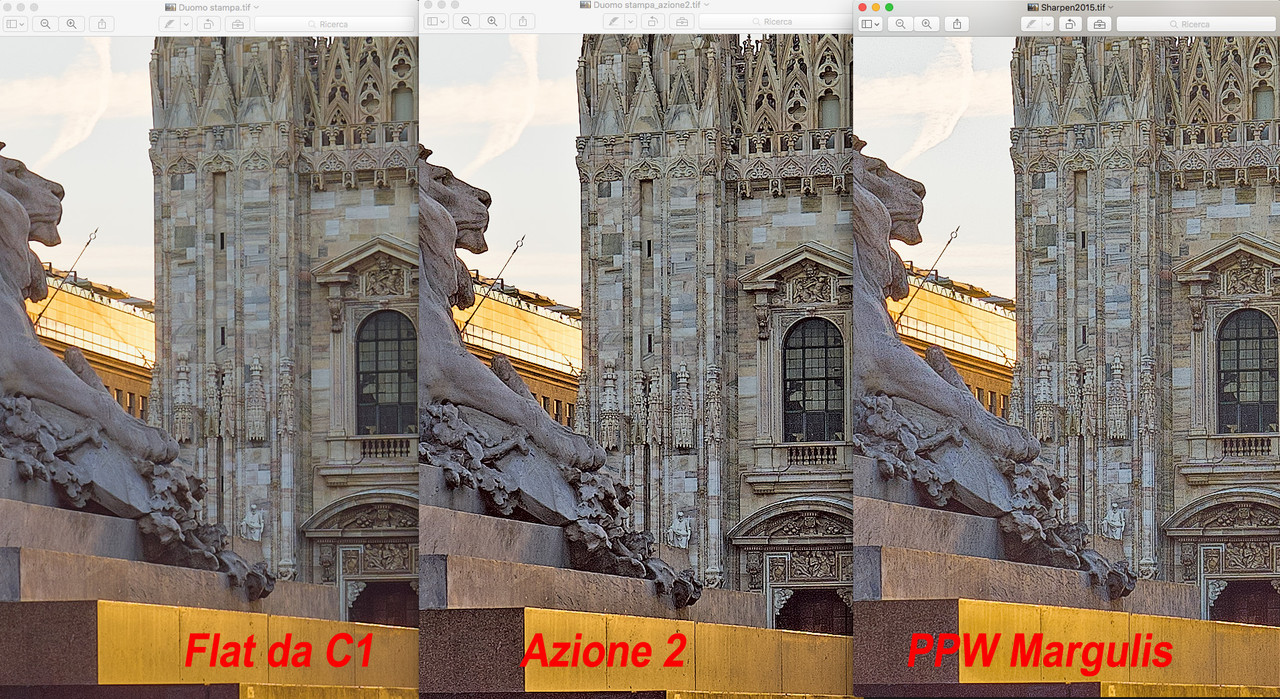 Dunque.... la stampa introduce dei workflow differenti a cui i comuni utenti non sono abituati, non stampando mai. Tendenzialmente, per un corretto utilizzo a video, basta uno sharpening di default da C1 e si è a posto, meglio se si azzera la soglia così agisce sui dettagli molto fini (a patto che il file non sia rumoroso) e fine della solfa. Se si deve andare in stampa, serve lo sharpening finale, quello che dona corposità alla foto. Se vogliamo risolvere la questione pigiando un semplice bottone, ecco cosa succede... a sx normale C1, al centro azione 2 (100% metodo di fusione normale) ed a dx PPW di Margulis