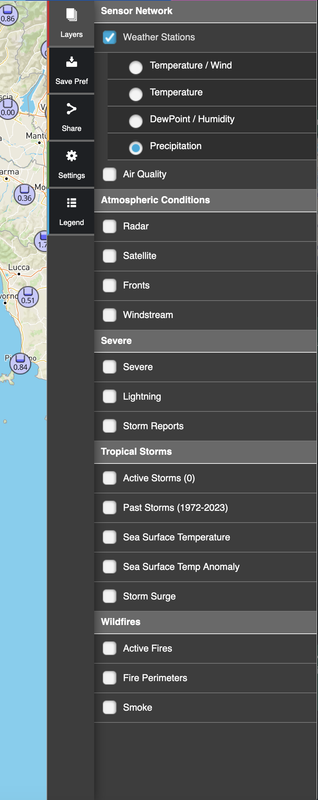 Ogni cerchietto è una stazione meteo e nel cerchietto sono indicati i mm di pioggia un tempo reale.