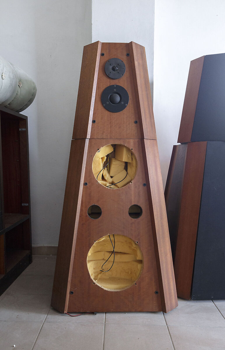Juan, Juliana, avevo un laboratorio riparazioni tv, a fianco c'era un anziano falegname ebanista, gli feci un disegno e lui realizzò "sti due sarcofagi" con truciolare da 3mm rivestiti con compensato di ciliegio da 5mm, placche di mogano massello agli angoli e lucidate a mano con gommalacca e spirito, un lavoro da matti ma siamo intorno all'anno 1990. Poi, ultimamente, sono entrato in contatto con Fabio e..., tra le tante altre cose, mi ha fatto togliere tutta la gommapiuma prima di montare i nuovi woofer.