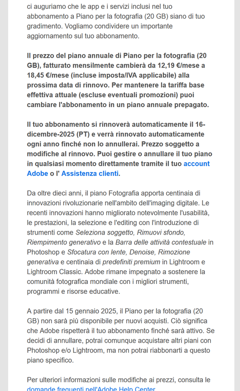 Io ho il piano minimo comprato un anno fa su amazon, scontatissimo. Mi scade a luglio 2026. Ho tempo per pensarci. A prescindere da cosa uno ci faccia o no, che non sta a me ipotizzare, credo che si debba dividere la tipologia di utenti che usano i prodotti fotografici in generale ed Adobe in particolare. Ci sono i professionisti e gli amatori (con una infinità di sfumature e tipologie di utilizzo basate anche sulle proprie necessità e competenze personali). Quindi le decisioni e gli utilizzi sono differenti in base alle proprie reali (o pseudo tali) necessità. Io uso pochissimo Photoshop. Per me e' un nice to have. Lo preferisco ad altri prodotti, non perche' (parlo nel mio caso specifico) lo ritenga migliore, ma perche' lo conosco un po' meglio degli altri prodotti (lo ammetto, problema mio di competenze specifiche, ma ora sto studiando altri prodotti). Certo e' ottimo grazie all'AI nella correzione, generazione di immagini. Con AI mi sto divertendo molto. Viste le offerte che ci sono state, ho acquistato un anno di cloud scontato che ho "allungato" periodicamente in base agli sconti periodici. Oggi, onestamente, non credo di rinnovarlo/allungarlo, visto gli aumenti (che in generale possono anche starci e che non discuto in assoluto, visto i servizi offerti, ma che nel mio caso non sono giustificabili dall'utilizzo che ne faccio io). Cioe' quello che voglio dire, ciascuno farà le proprie scelte in base al reale utilizzo che pensa di farne del prodotto. Io poi per lo sviluppo dei NEF (raw Nikon), preferisco sempre il SW Nikon Studio NX (con tutti i limiti noti ed evidenti, ma con la capacità, secondo me, di creare dal NEF Nikon il miglior file in linea con i settaggi ed i Picutre Control di Nikon e le correzioni delle lenti Nikkor Z. Poi per la riduzione del rumore, preferisco i SW DXO e per le rifiniture finali a parte Photoshop (che io da ignorante preferisco a livello utente, conoscendolo meglio), oggi posso farle tranquillamente con l'ottimo (secondo me) Affinity Canvas (che ho iniziato ad approfondire e che non e' male). E sono a posto. Poi, certo, alcuni strumenti come il Bridge sono utili, ora sto studiando XnViewMP che a me basta e avanza (per quello che faccio io, da dilettante scarso, considerando anche che non sto utilizzando nemmeno il Bridge nemmeno ora). |