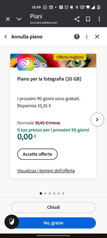Ho l'impressione che Adobe pur di non perdere il cliente sia disposta a scendere a compromessi. Qualche giorno fa ho aiutato un amico a disdire il piano fotografia da 20gb con pagamento mensile in scadenza in quei giorni. Al momento della conferma di chiusura del piano è comparsa questa offerta