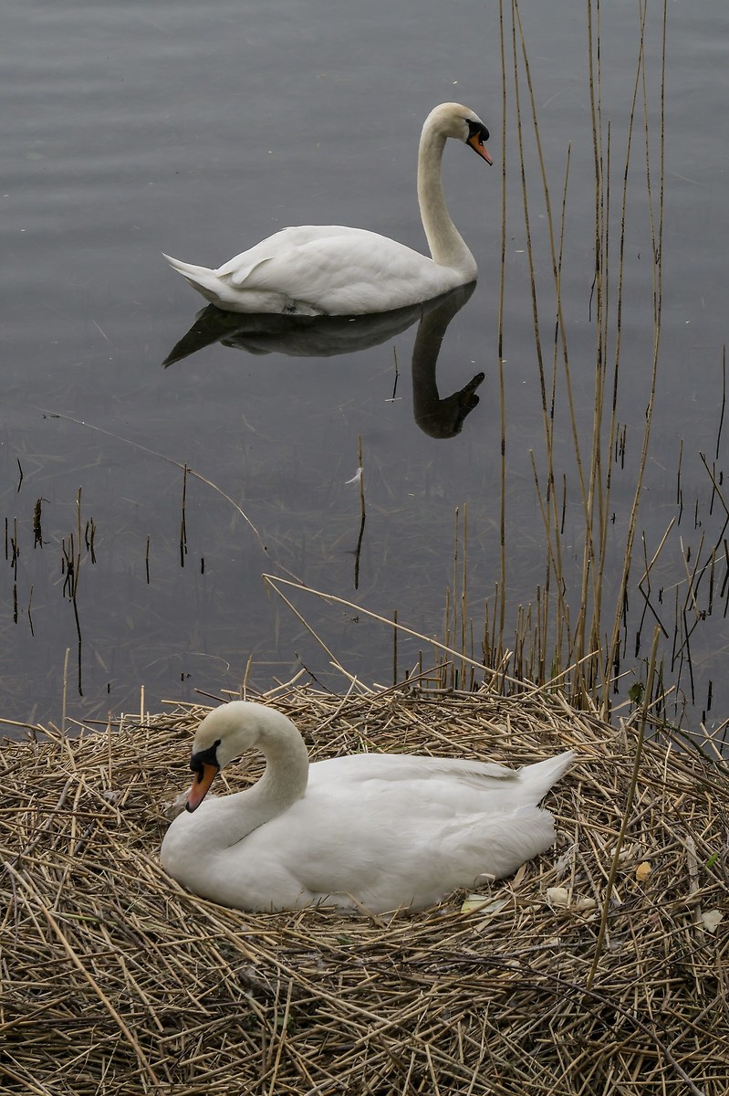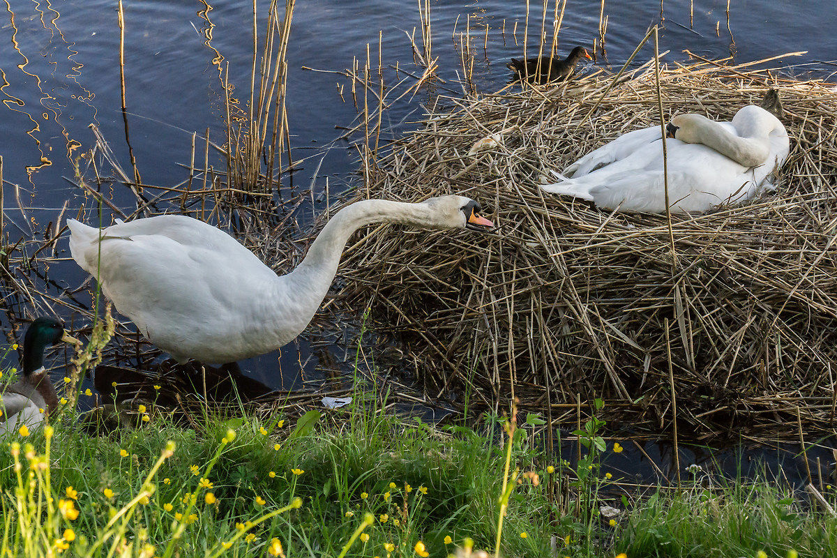 Qui lui lavora all'ampliamento del nido mentre lei cova le uova. Il germano sul bordo sinistro mi ricorda quei pensionati che passano i pomeriggi ad osservare i cantieri. P.P.S.: poi metto anche queste