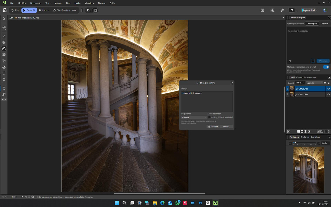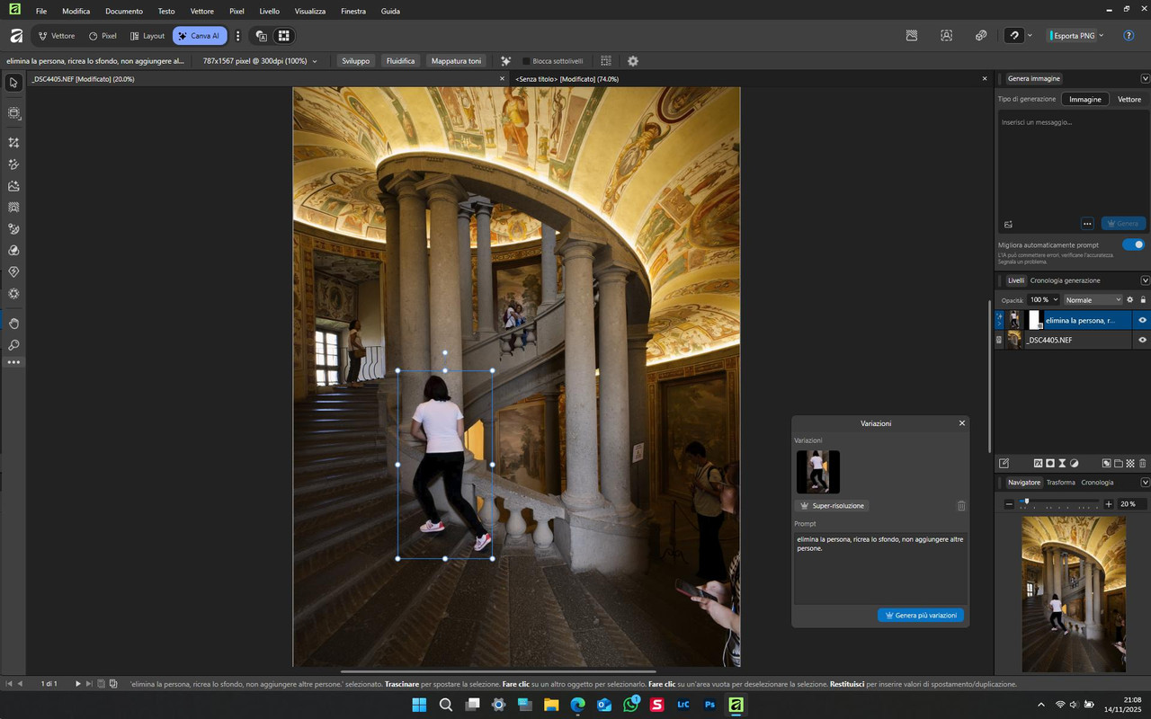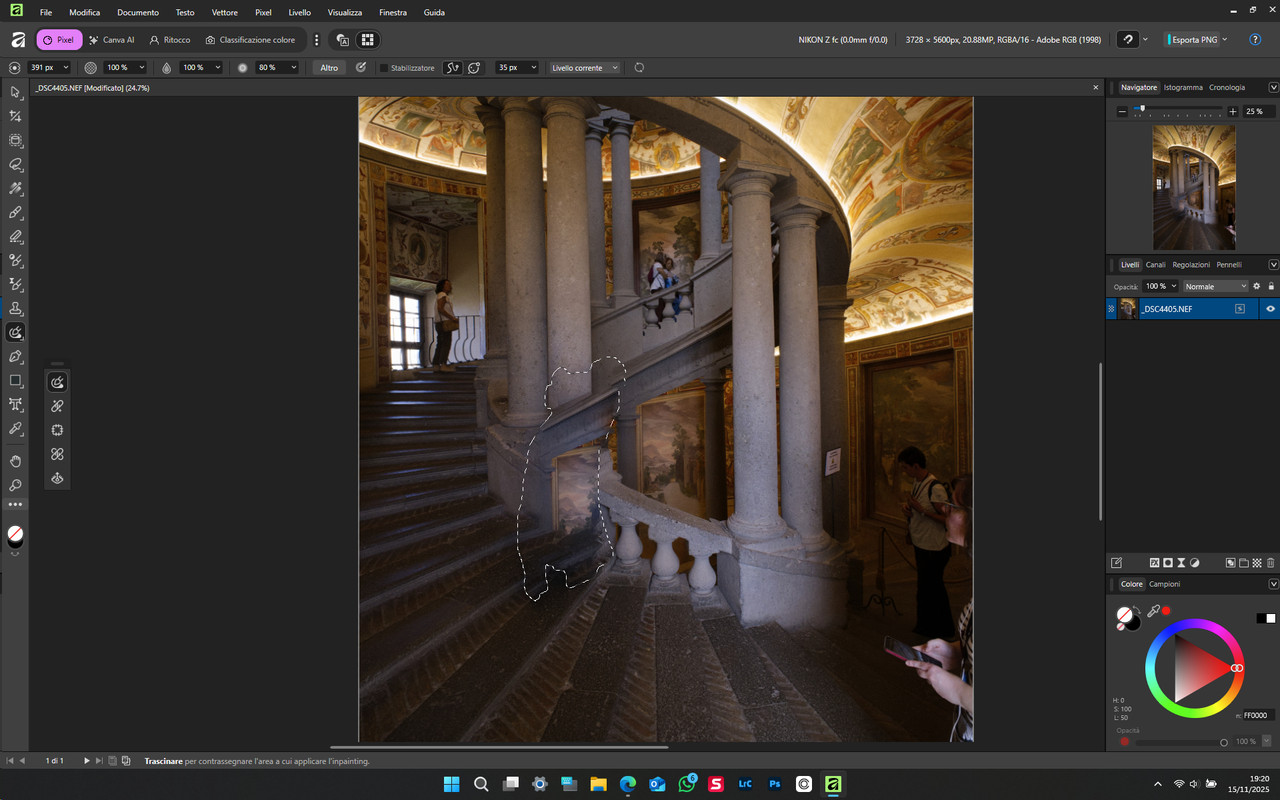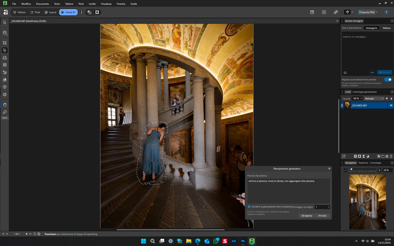 Faccio una premessa. Il mio flusso di lavoro è sviluppo del raw con Capture One. E lì, svolgo il 95% del lavoro. Uso PS, solo per la rimozione generativa di persone o oggetti di disturbo. Pago l'abbonamento annuale per Capture One, e pago l'abbonamento (attualmente 18 euro e rotti al mese per PS e LR)(LR che non uso tra l'altro). Ho provato con l'IA di affinity canva per la rimozione, in questo caso complicata, di una persona. Ho scelto una foto difficile, praticamente è un luogo dove è difficile non avere persone in mezzo e nel mentre aspettavo il momento propizio, ho fatto delle prove per l'inquadratura ecc. E la foto in oggetto è proprio una delle prove con le persone di mezzo (giusto per spiegare).