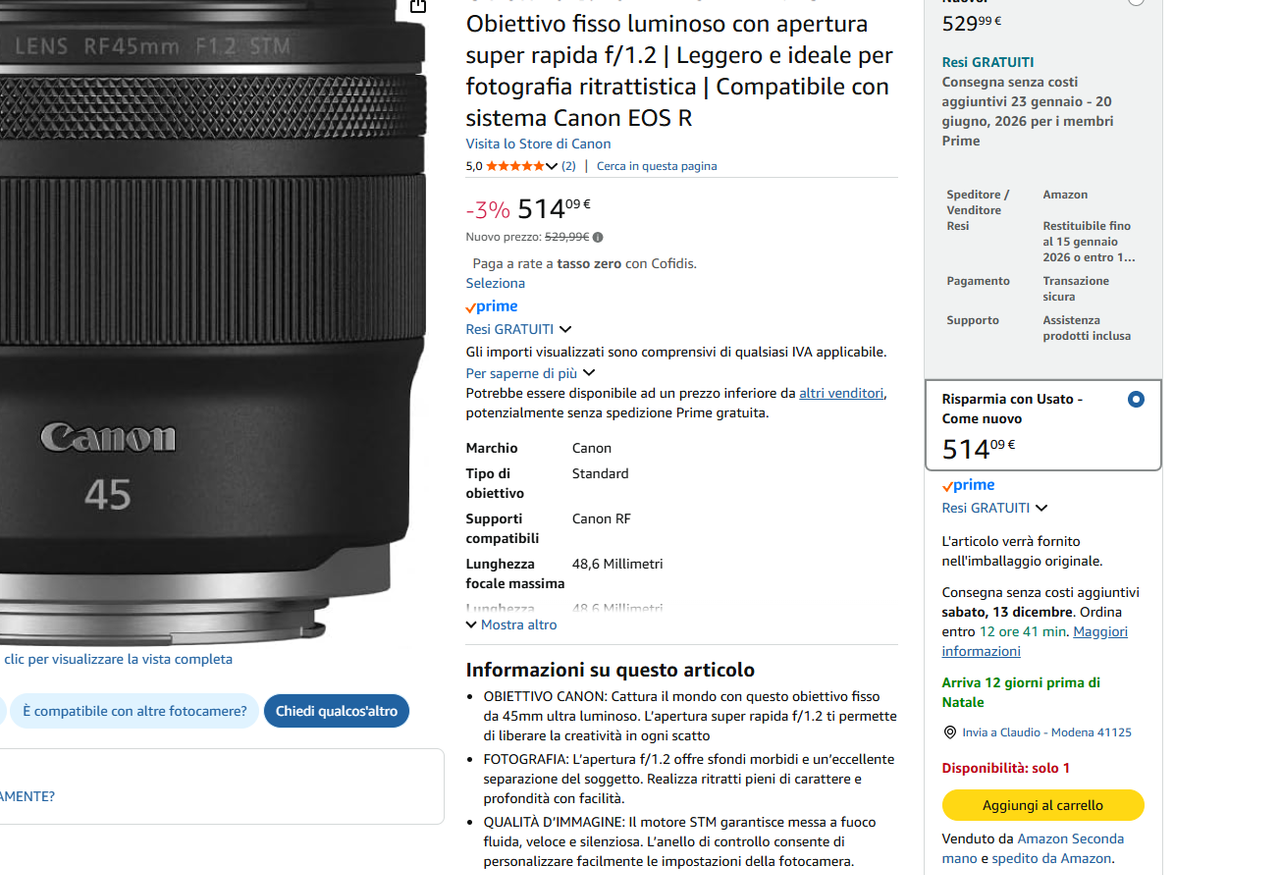 1/1000s f1.2 6400 iso (dxo pl 8.11) Ho utilizzato dxo pl 8.11 con il suo profilo generico (oggi hanno aggiunto tramite aggiornamento, varie nuove macchine tra le quali anche la nuova R6III, manca ancora però il profilo del 45, sono sicuro che arriverà presto) A f1.2 con questo profilo generico, la nitidezza è il minimo sindacale (meglio con DPP che già lo incorpora), ma già sufficiente per la pelle, secondo me è giusta, ne troppa ne troppo poca, a f2/f2.2 invece, è naturalmente più inciso e la pdc è più idonea per avere a fuoco una parte del viso/persona, da li in avanti (f2.8, f4 etc), diventa tutto più nitido e con una sufficiente pdc, si può modulare secondo le preferenze. Non aspettatevi la IQ del RF50f1.2L o del RF85f1.2L che fanno un altro mestiere , diciamo che è più un obbiettivo economico luminosissimo, piccolo, leggero, un tuttofare da portare sempre in giro, per le vacanze, street, ritratti etc, l'ho messo nella borsa e lo porto tutti i giorni con me. Se vi accontentate, può essere utile, divertente e con un certo carattere. Sinceramente ero scettico, ma tutto sommato, ora credo di avere fatto bene a prenderlo in sostituzione del RF24-105f4 per uso generico, per quello che serve a me andrà benone specialmente quando usciranno i profili specifici per DXO PL. Un saluto a tutti, ciao |