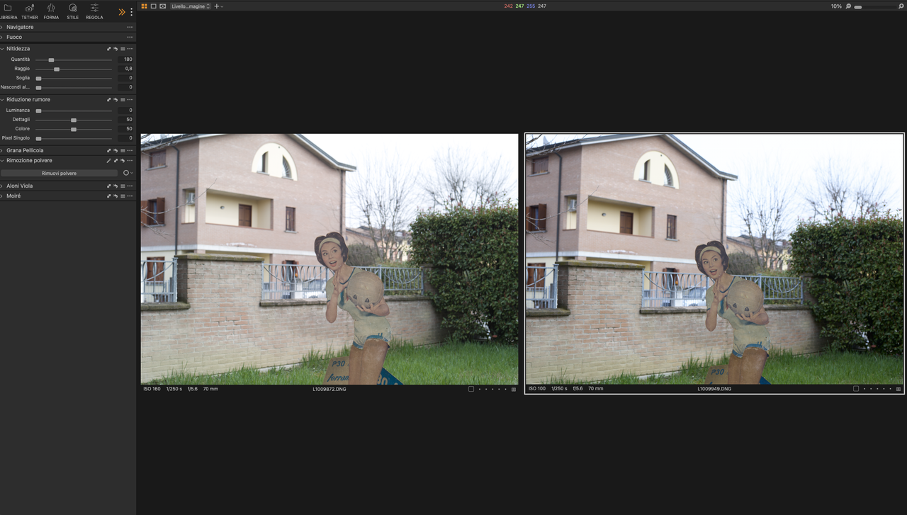 “ Una Nikon D70 ed una D200 che mi hanno regalato enormi soddisfazioni nel ritratto „ Domenico, ma le digitali in mano a te si bruciano Comunque, procediamo.... un utente anonimo, mi ha gentilmente fornito alcuni file su richiesta, ho selezionato i due che tolgono qualsiasi dubbio di confronto. Leica S2 (37,5MP) con 70mm a F5,6 Leica S3 (64MP) con 70mm a F5,6 Foto della stessa scena su cavalletto, stessi dati di scatto. Ho tentato di allineare WB ed esposizione