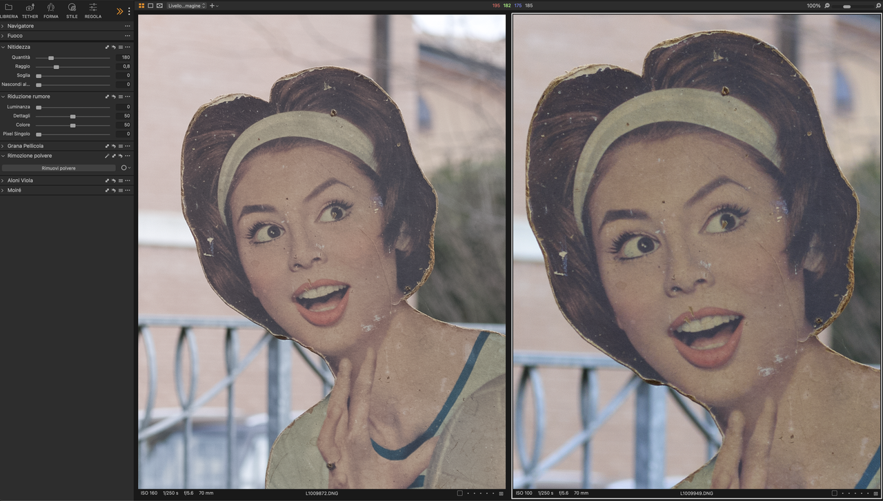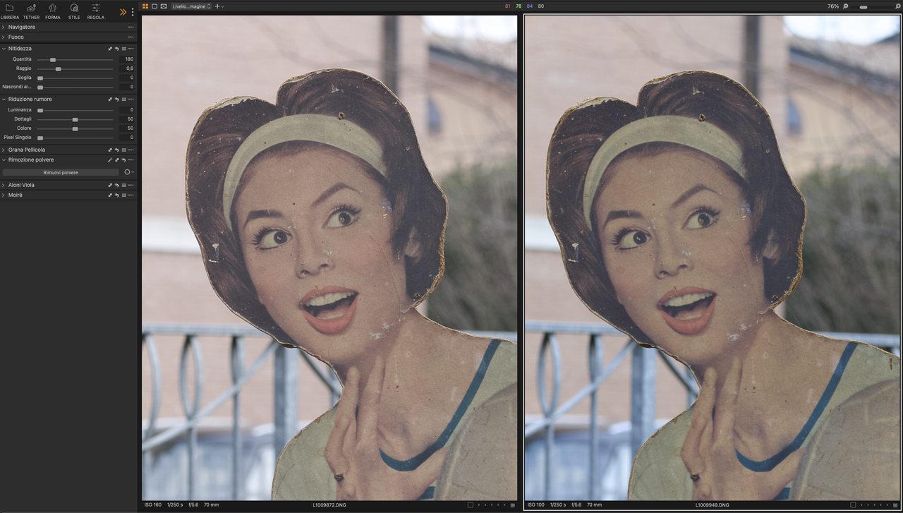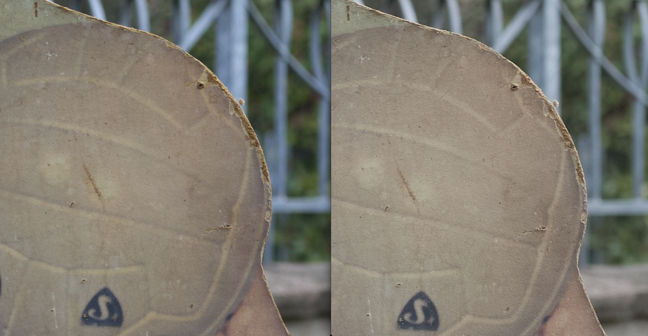 Adesso invece ho portato il file da 37,5MP della S2 a 64MP ingrandendolo con PS A proposito di maggiore acutanza, questo è un 200% dei due files.... S2 a dx