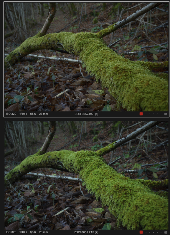 Basta guardare le foglie di una e dell'altra per capire che stiamo paragonando una foto sovra esposta per quanto riguarda la XT5 quindi per nulla allineata con l'altra. E' chiaro che poi i verdi passano al fluorescente.