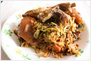 Ok Maurizio Pesto di lardo bianco,con spicchio d'alio e prezzemolo. 250 g di fagioli borlotti secchi 2 belle patate 4-5 costine di maiale affumicate oppure 100 g di pancetta affumicata una foglia di alloro sale 2 cucchiai d'olio extravergine d'oliva un cucchiaio di farina 00 Per i crauti: 400 g circa di crauti 2 cucchiai d'olio extravergine d'oliva uno spicchio d'aglio semi di cumino PREPARAZIONE DELLA RICETTA Metto a bagno i fagioli in abbondante acqua tiepida. Il giorno dopo li scolo e li metto in una casseruola con circa 2 litri di acqua fredda,il pesto di lardo bianco circa 250gr, le costine di maiale sgrassate e la foglia di alloro. Metto la casseruola sul fuoco e, quando inizia l'ebollizione, abbasso la fiamma e proseguo la cottura per circa un'ora prima di aggiungere le patate, sbucciate e tagliate a dadi e una presa di sale. Proseguo la cottura fino a quando i fagioli sono teneri (40-50 minuti). Mentre i fagioli si cuociono, preparo i crauti. Scaldo dunque l'olio in un tegame e faccio imbiondire lo spicchio d'aglio schiacciato, poi lo elimino e metto nel tegame i crauti ben strizzati e un cucchiaino di semi di cumino. Faccio insaporire i crauti per qualche minuto mescolando, poi li copro a filo di acqua calda e li faccio cuocere, a fuoco dolce, per circa 40 minuti, fino a quando non sono quasi asciutti. Quando fagioli e patate sono cotti, ne passo al passaverdure circa la metà, lasciandoli cadere direttamente nella pentola con gli altri. Verso nella pentola anche i crauti e lascio tutto sul fuoco con la fiamma al minimo. Scaldo l'olio in una padella, aggiungo la farina versandola a pioggia e la faccio rosolare mescolando continuamente fino a quando diventa color nocciola. Unisco questo roux alla zuppa, mescolo e assaggio per regolare il sale. Lascio la zuppa sul fuoco ancora per una decina di minuti e la servo ben calda. Come tutte le preparazioni ricche di ingredienti, la jota è molto più buona il giorno dopo, quando i sapori hanno avuto il tempo di amalgamarsi. |