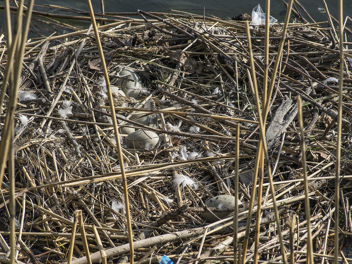 Si noti il nastro messo dal personale del Parco del Ticino dopo il fallimento della cova del 2018, probabilmente perché i cigni erano stati disturbati. Nel 2019 invece è stato a causa delle pioggie torrenziali che hanno spostato, infradiciato e sommerso parzialmente il nido. Confrontando la prima foto di quest'ultima serie serie con le ultime due, prendendo come riferimento l'avviso attaccato al nastro, si può constatare quanto il nido si sia spostato. |