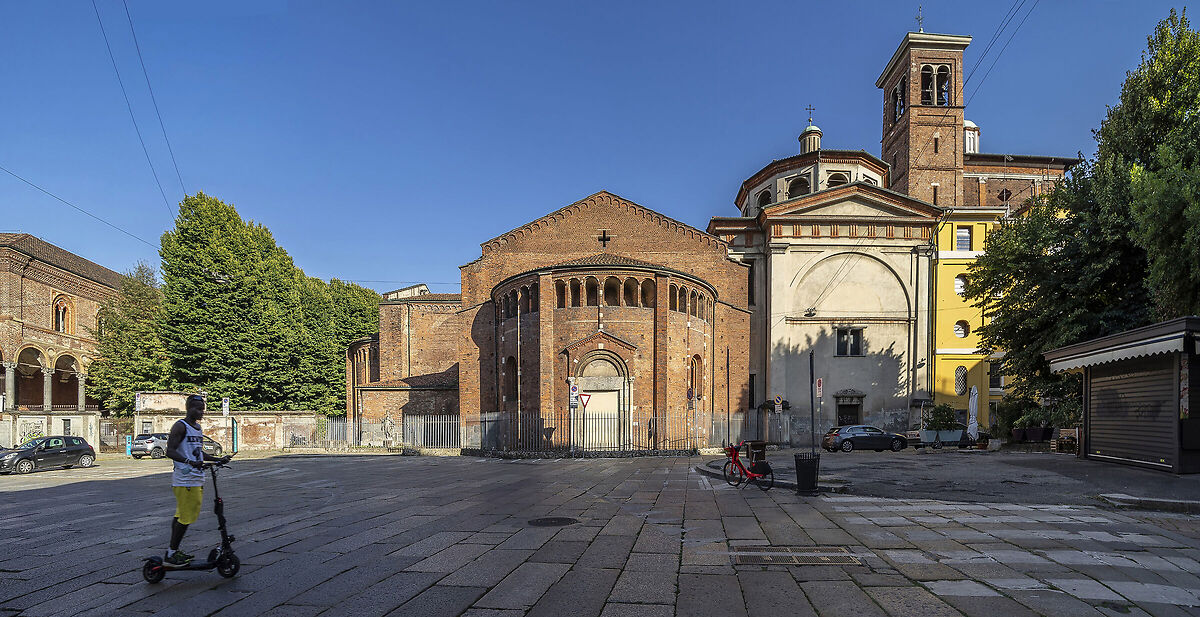 No, sono i muri plurisecolari (alcuni ultramillenari) della Basilica e del campanile ad essere inclinati. In ceri punti persino inclinati "in avanti"; che da un punto di vista statico è la situazione più sfavorevole; ma stanno così da secoli e sono ancora in piedi. Ci ho lavorato parecchio. Ho radrizzato le verticali con DxO View Point e ho osservato attentamente l'edificio in loco. Un esempio analogo è rappresentato dall'abside di San Lorenzo Maggiore (altra basilica ultramillenaria):