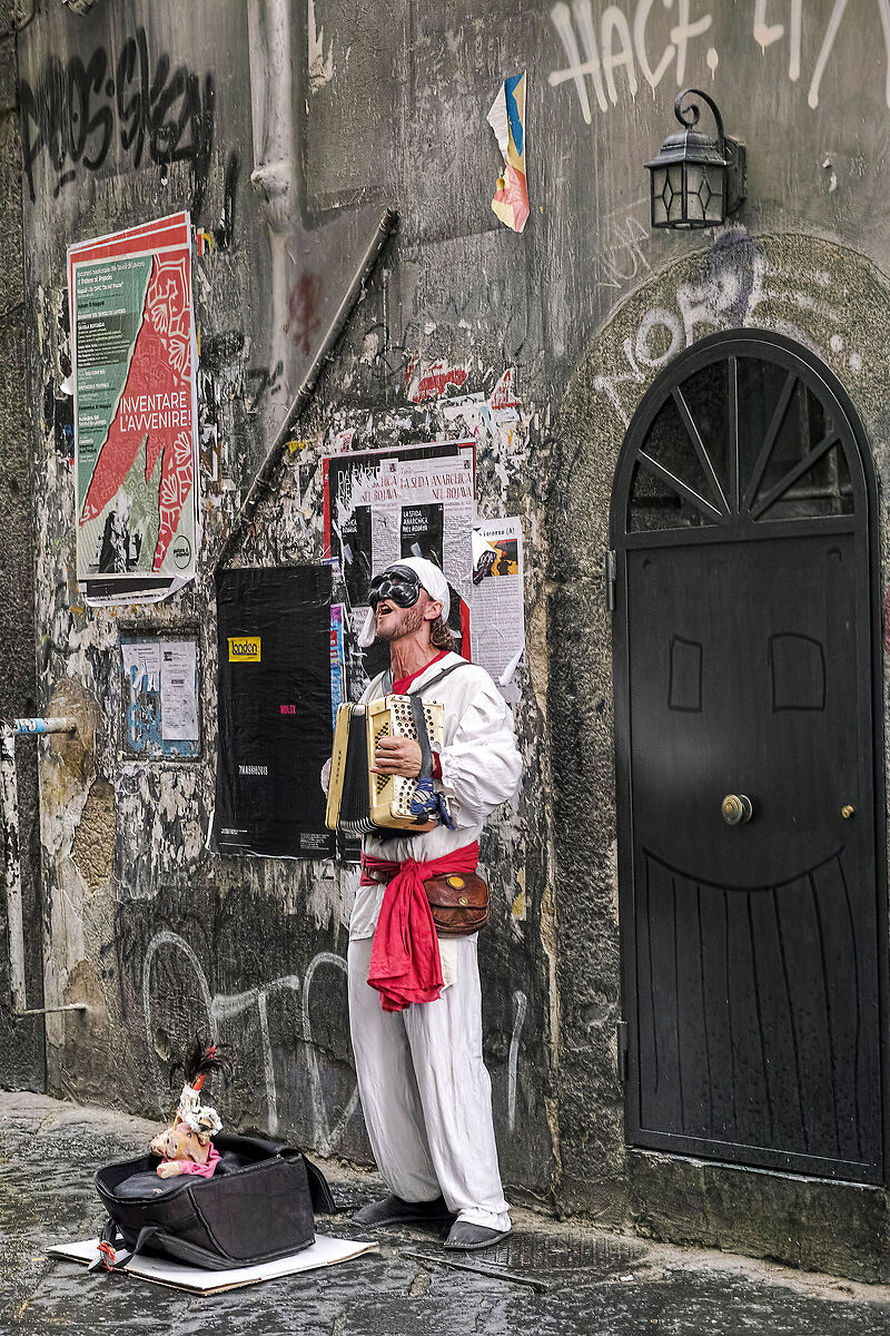 Girando per la città, oltre il pulcinella dell'artista Lello Esposito -già segnalato-, potreste incontrare un Pulcinella in carne e ossa + ottima voce...