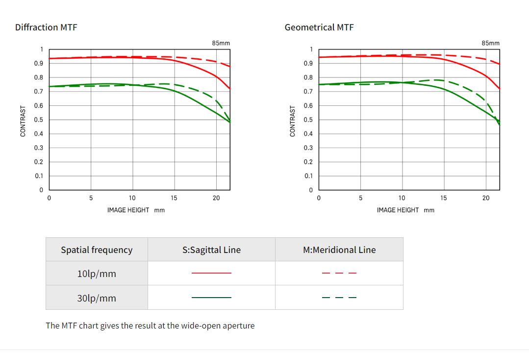 Per esempio, ecco il Sigma Art 85/1.4. Sigma non misura l'MTF degli obiettivi, pubblica le MTF calcolate come da progetto ottico, con e senza diffrazione.