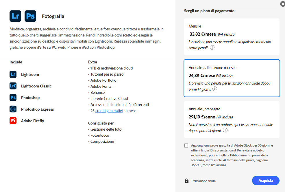 l'alternativa è il piano da 1tb con relativa perdita di crediti AI. Personalmente, non avendo usato per niente l'AI nella suite adobe se non per gioco, preferisco mantenere i 250 crediti anzichè avere la sorpresa di rimanere a corto una volta preso confidenza con l'ultima tecnologia arrivata. La differenza sono 30€ / anno. pazienza